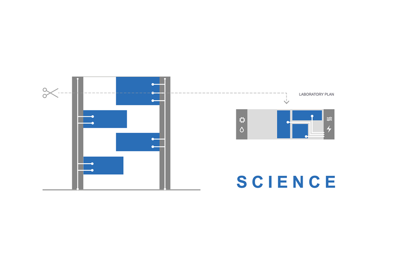 The mechanical rooms and shafts required for the laboratories, together with the vertical structural cores, are organized at both ends of the building, which then delivers the various building mechanical systems horizontally through the ceilings of the central corridor to different laboratories. This configuration leaves the research floors open and allows flexible re-partition should alternative future changes be needed. The research labs are planned according to a basic module. Offices and ancillary spaces are arranged in vicinity, to offer scientists both quietness and convenience.
