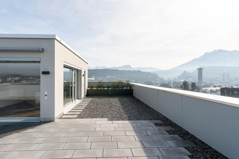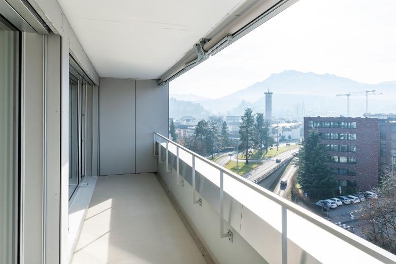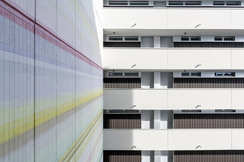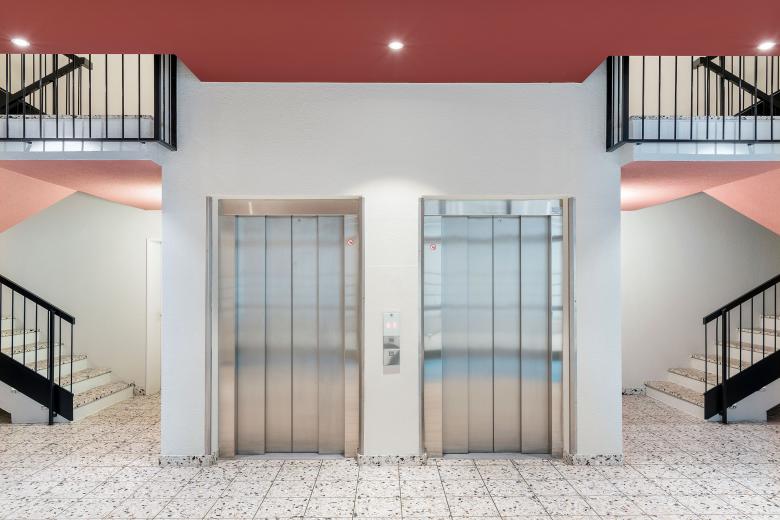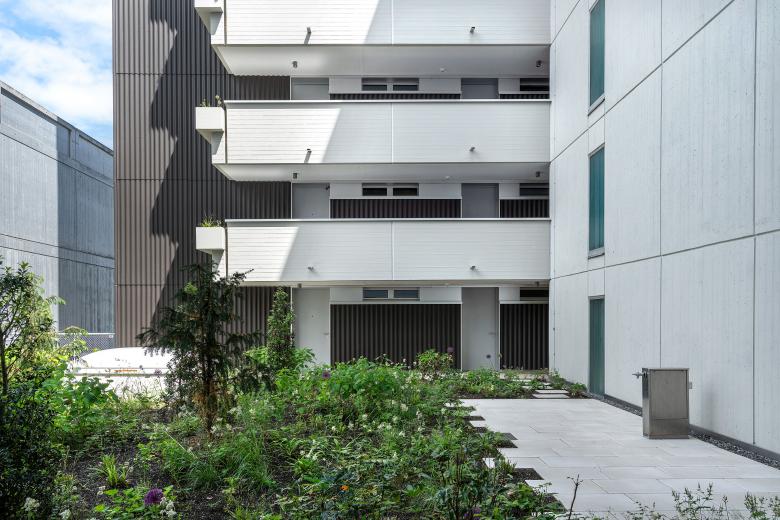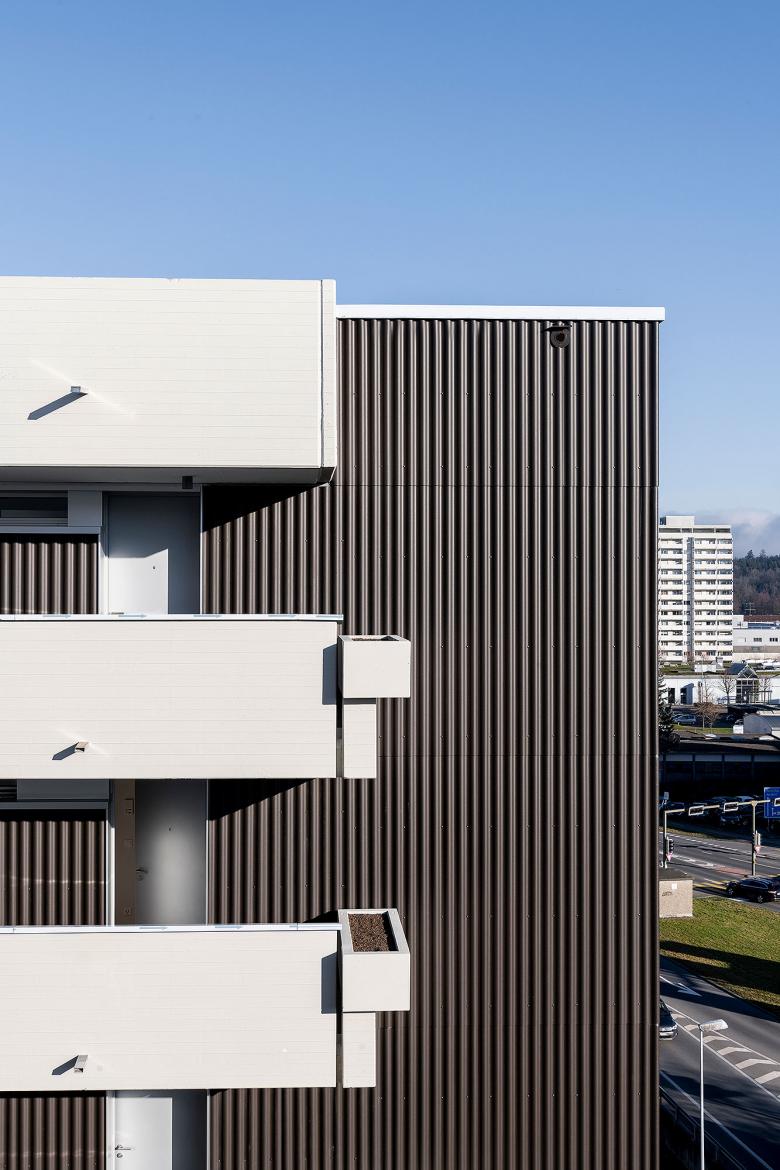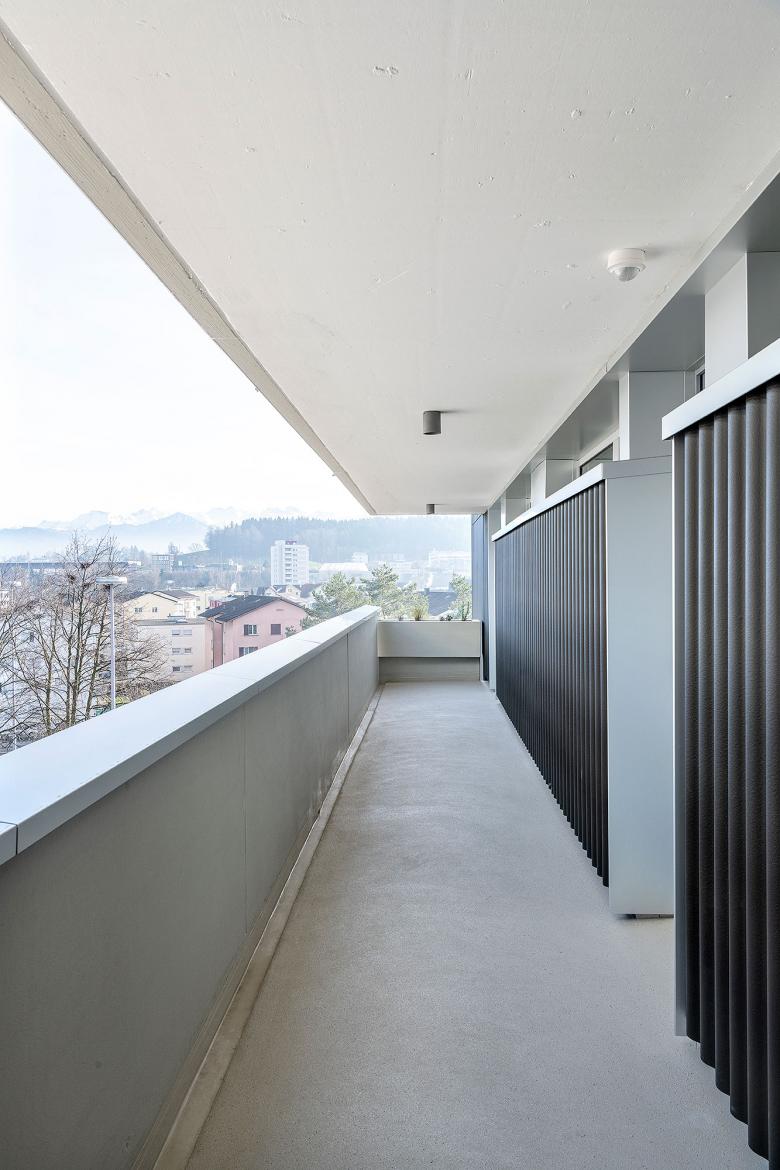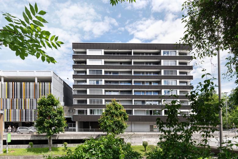 Für die Gesamtsanierung der beiden Wohngebäude aus dem Jahre 1974 wurde aus statischen Gründen ein Rückbau bis auf die primäre Betonskelettstruktur notwendig. Neue Raumstrukturen sorgen dafür, dass die Wohnungs- und Zimmergrössen sowie Küchen und Nasszellen wieder den heutigen Bedürfnissen entsprechen. Die gesamte Gebäudetechnik wurde ersetzt und eine komplett neue Gebäudehülle mit Fassadenphotovoltaik installiert. Durch die umfassende Gesamtsanierung kann der einprägsame Bau an ortsbaulich prägnanter Lage wieder seine volle Wirkung entfalten. Der bedachte Umgang mit den vorhandenen, noch intakten Elementen der Primärstruktur zeugt von einer nachhaltigen und ressourcenschonenden Bauweise.