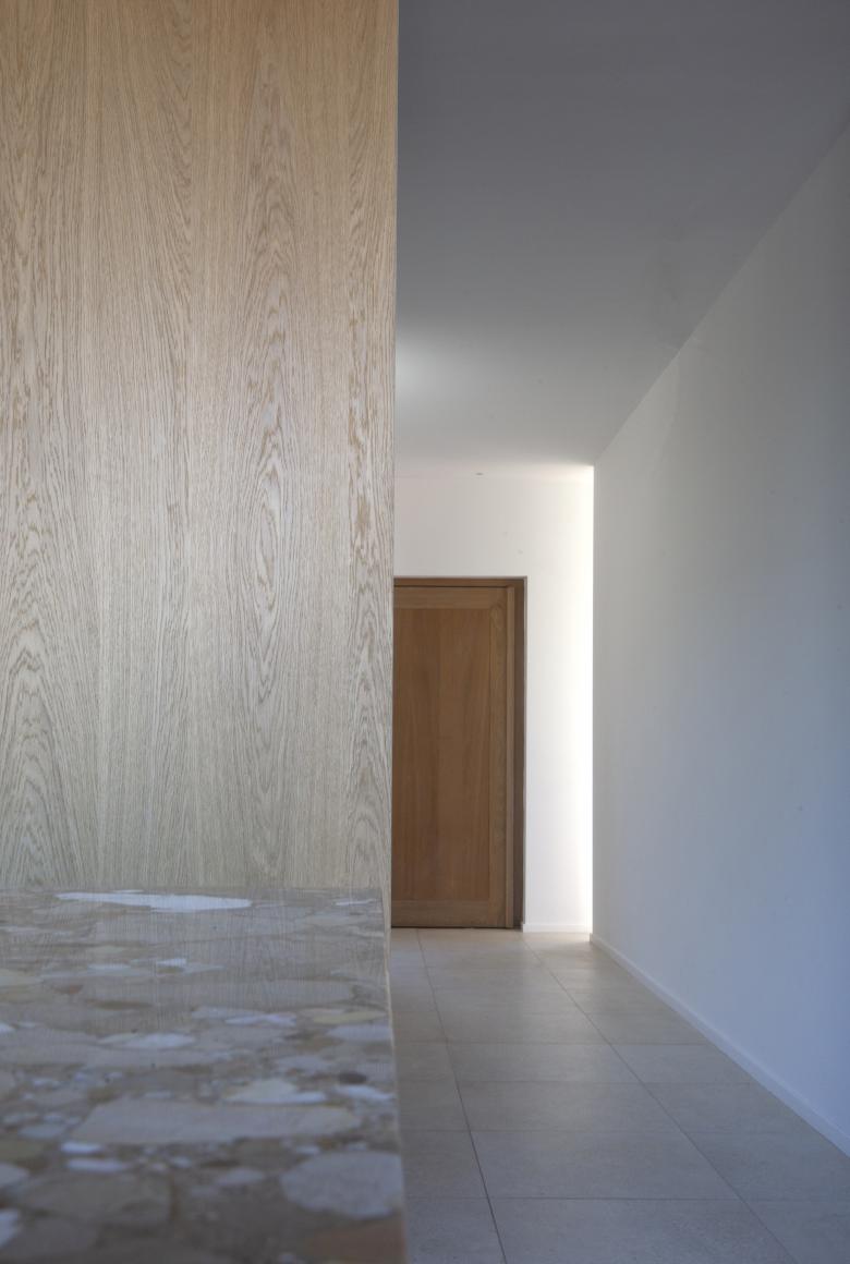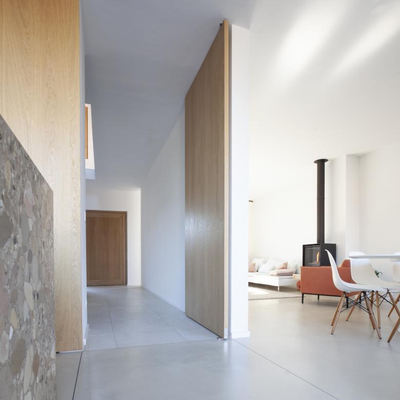 Intern werden 4 kleine kamertjes op de benedenverdieping opengetrokken tot één ruime leefruimte met een riante keuken, een eethoek en een zitruimte. Ook de inkomhal kan bij deze leefzone betrokken worden door de grote pivoterende deur open te zetten. In gesloten toestand gaat de deur volledig op in de keukenwand. Het toilet komt los van de inkomzone door deze een paar treden lager te positioneren op bestaand niveau van de oorspronkelijke garage.