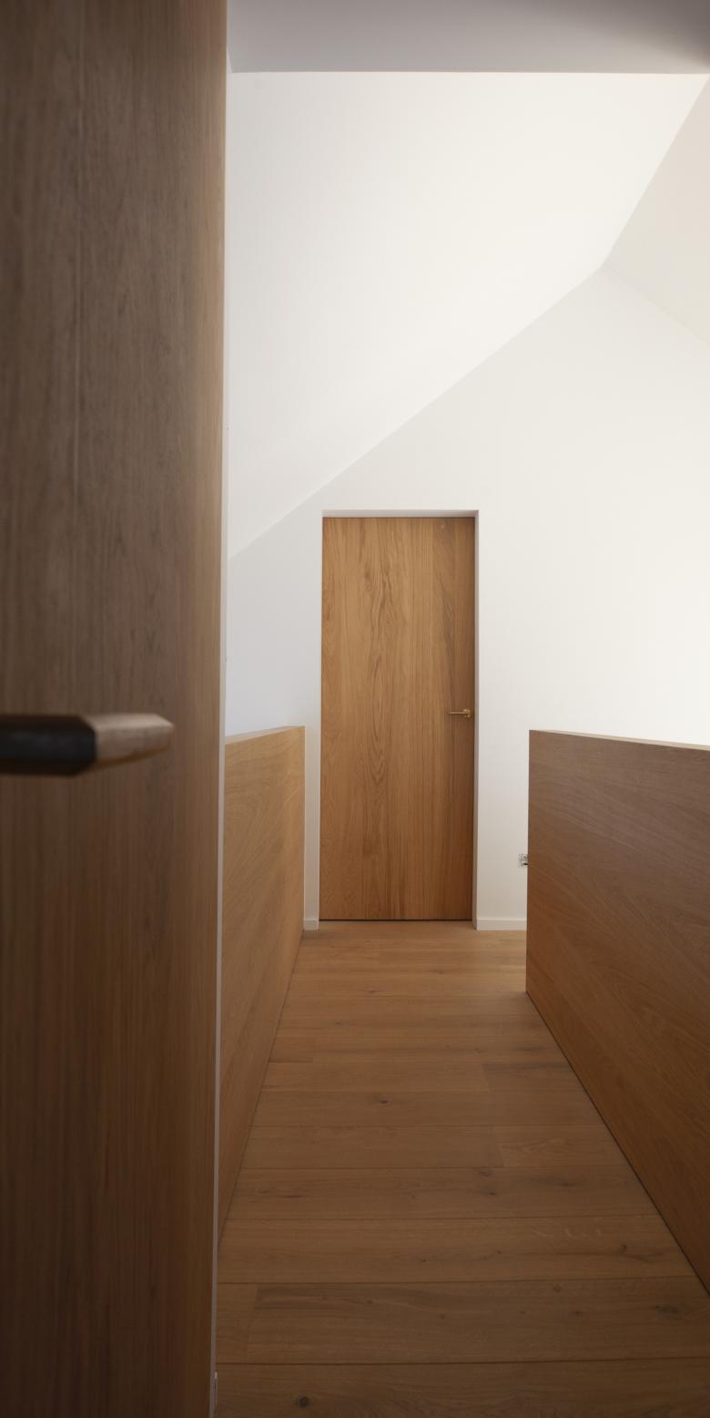 Part of the ceiling in the night hall was removed to create a double-height void connecting to the attic. A wooden staircase and walkway provide access to a dedicated children’s living area. From the walkway, visual contact is possible from the attic down to the ground floor. From the reverse viewpoint, the walkway appears to float within the space.