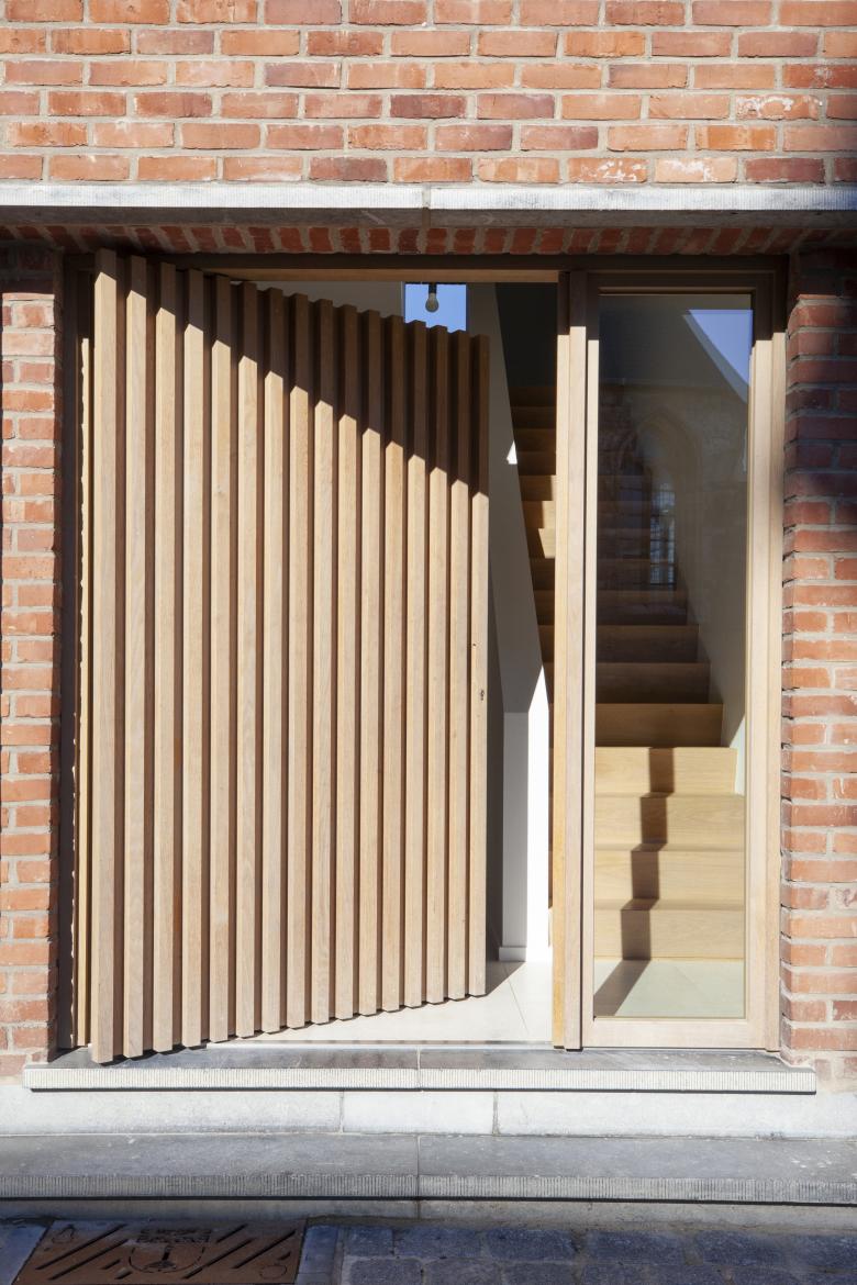 De materiaalkeuze in de leefruimtes is robuust en afgestemd op de architectuur van het begijnhofhuisje. Het hout uit het buitenschrijnwerk is binnen ook aanwezig en vormt een tegenpool voor de gepolierde betonvloeren en het natuurstenen tablet van het keukeneiland. De kleurtoon van natuursteen en hout zijn op elkaar afgestemd.
