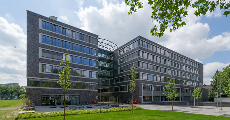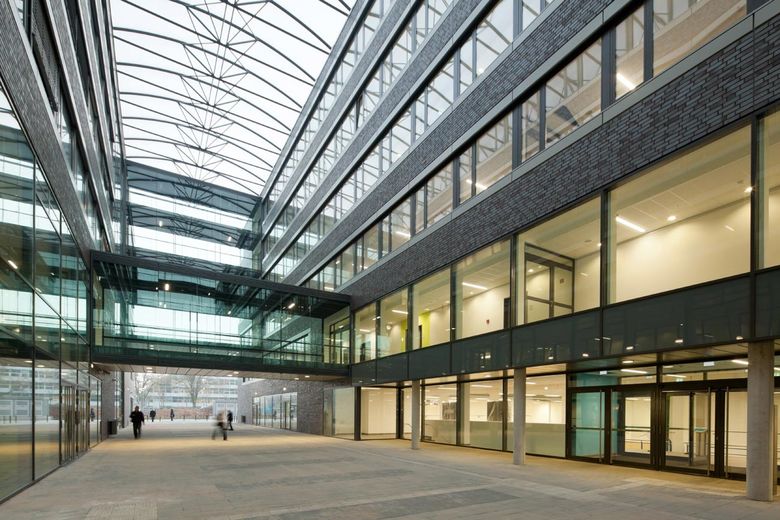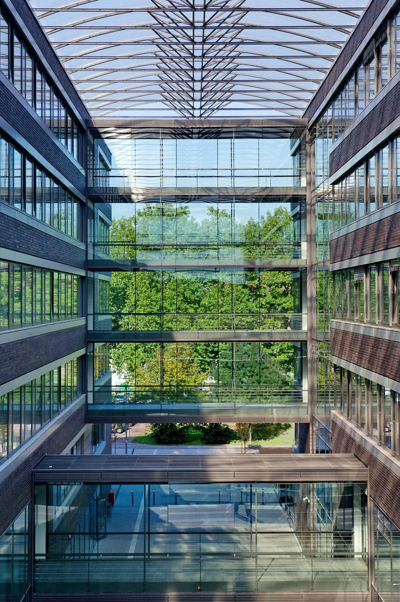 dem gesamten Gebäude ist ein zweigeschossiges Parkhaus untergebracht, das 450 Stellplätze für die Angestellten und Schüler bereithält.