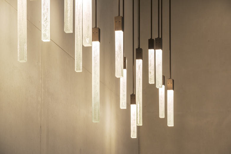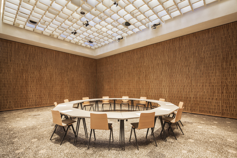Ein zentrales Oblicht beleuchtet den Raum. Das Tageslicht wird von verschieden hohen Überzügen geleitet, es entstehen helle und dunkle Bereiche. An der gegenüberliegenden Seite erstrahlen modern interpretierte Kronleuchter in linearer Anordnung den hohen Raum.
