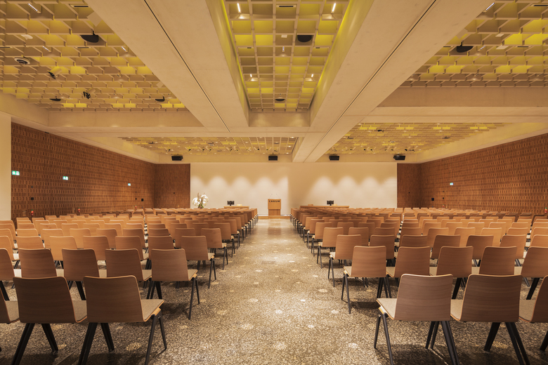 Das unter der Erde liegende Auditorium öffnet sich mit einem mächtigen Vordach als Eingangsbereich im umschliessenden Terrain.