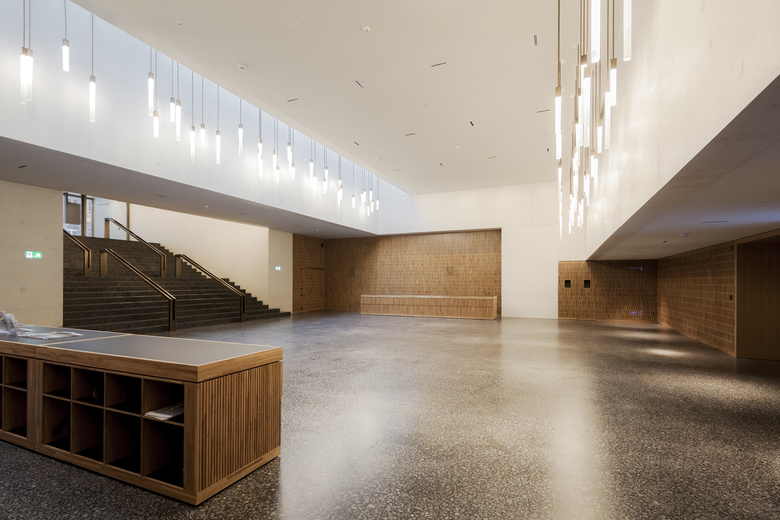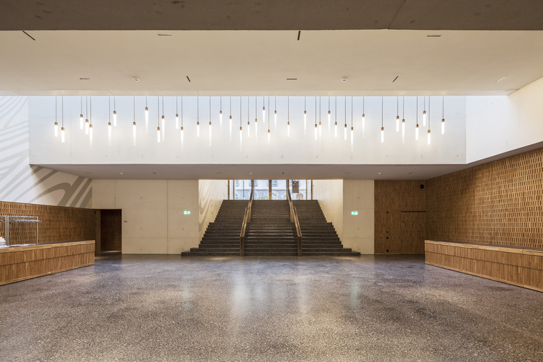 Eine grosszügige Treppe führt zum Foyer hinab. Die Erschliessung des Auditoriums wird durch eine Abfolge von hohen und niedrigen Raumteilen inszeniert. Im Foyer entstehen offene, hohe Bereiche und niedrige, geschützte Zonen.