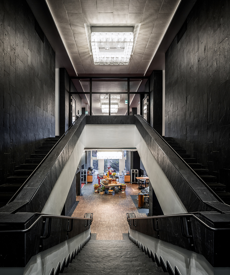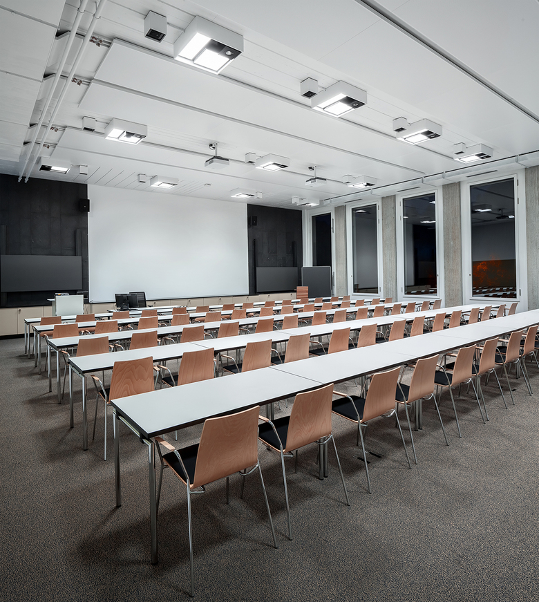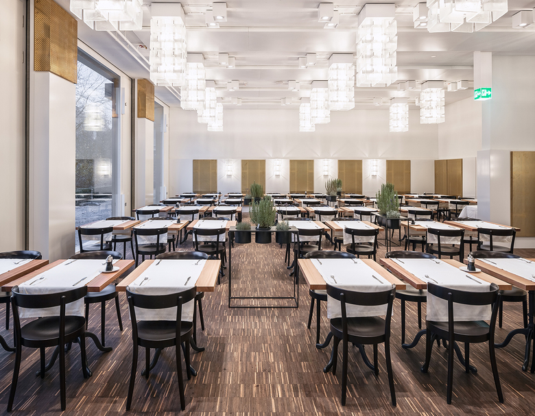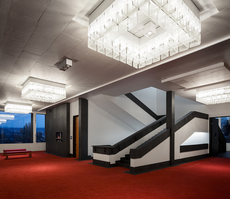 Das Beleuchtungskonzept fügt sich elegant in die erhabene Architektur ein und setzt im wahrsten Sinne des Wortes «Highlights». Eigens entwickelte Leuchten für den Seminar-, sowie den Restaurantbereich unterstreichen die Individualität und den einzigartigen Charakter des Gebäudes. In enger Zusammenarbeit mit mit dem Designer Martin Nievergelt entstanden grossformatige Kronleuchter und Wandleuchten. Die Leuchtertypen, als Einzelobjekte bewusst zurückhaltend gestaltet, überraschen in ihrer additiven Formation durch eine Rhythmisierung der Räume. Steckbare Flachstahlprofile bilden die Tragkonstruktion, dessen strenge Geometrie durch Brillanz und Diffusion von Schmelzkanten und Lufteinschlüssen der Dallgläser aufgebrochen wird.