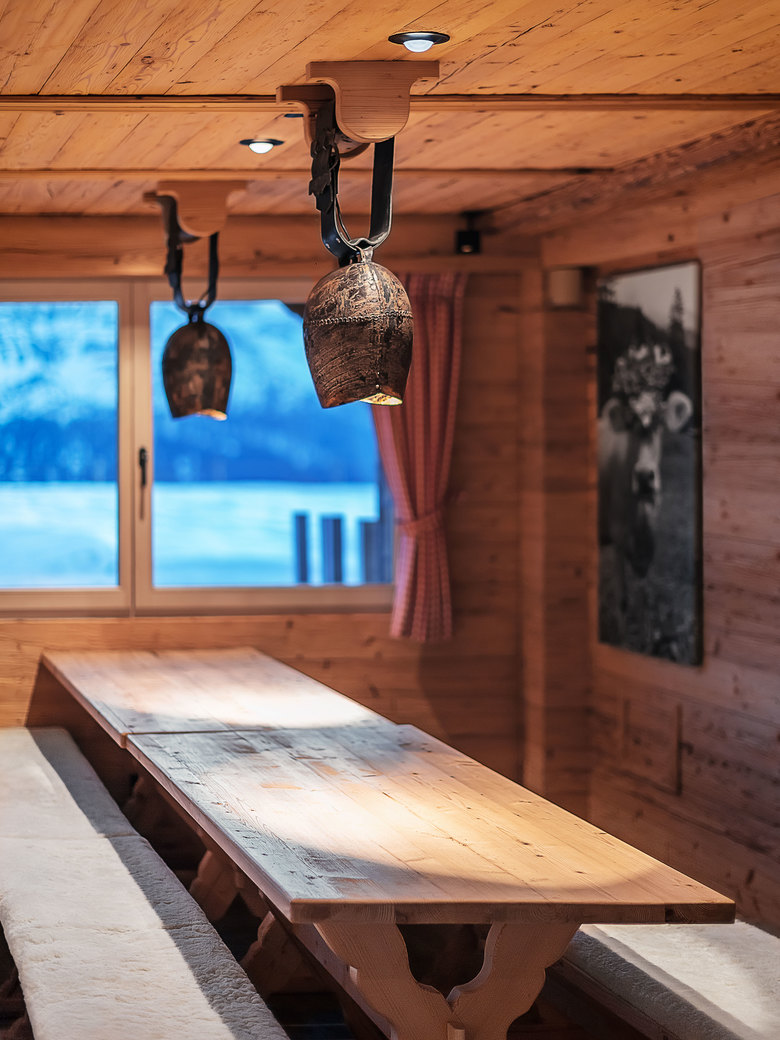Zu den Highlights gehören die eigens entwickelten Kuhglocken mit integrierten Downlights, die das Licht präzise auf Esstische und Sitzbänke lenken und diese vor dem Hintergrund dezenter Grundbeleuchtung optisch betonen. Für den Weinkeller wurde eine besondere Leuchte konzipiert. Über den Tischen hängen neun Meter lange Stahlträger, welche zwei Arten von Lichtkomponenten verbinden: Engstrahlende, gerichtete Downlights akzentuieren das Geschehen am Tisch. LED «Kerzen» auf dem Träger erhellen die Decke und harmonisieren das Gesamtbild.