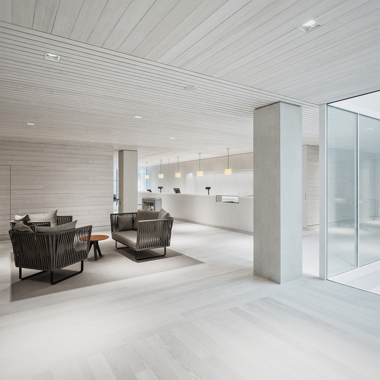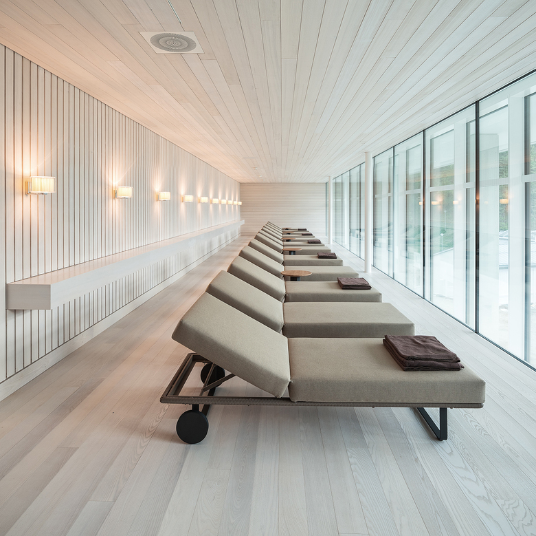 In den Wellness- und Ruhebereichen geschieht eine Herabsenkung der Lichtpunkthöhen, der Beleuchtungsstärken sowie der Lichtfarbtemperaturen, wodurch eine kontemplative Atmosphäre geschaffen wird. Obwohl subtile Differenzierungen in der Lichtführung bezüglich der verschiedenen Räume spürbar sind, werden diese durch eine allgemein zurückhaltende, weiche Beleuchtung sowie homogene Materialsprache verbunden.