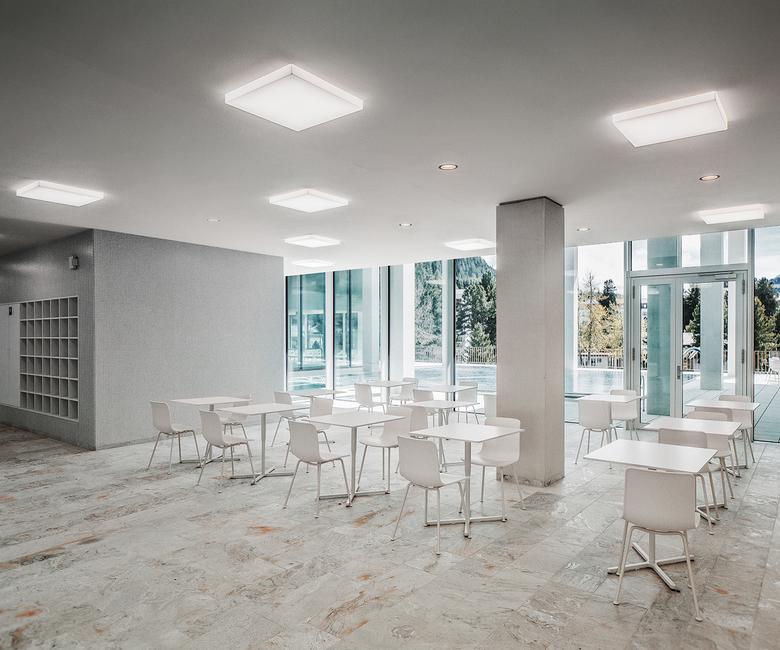 Das tagsüber vorhandene weiche, natürliche Tageslicht wurde mit künstlichem Licht in die Raumtiefen verlängert und additiv verstärkt. Um dies zu erreichen, wurden im Bädergeschoss präzise, geometrische Setzungen von diffusen Lichtfeldern vorgenommen, welche sich in das architektonische Raster integrieren. Die über den Becken in die Höhe springenden Raumvolumen wurden mit indirektem Licht komplementiert, um die Spannung zwischen den verschiedenen Raumhöhen zu unterstreichen.