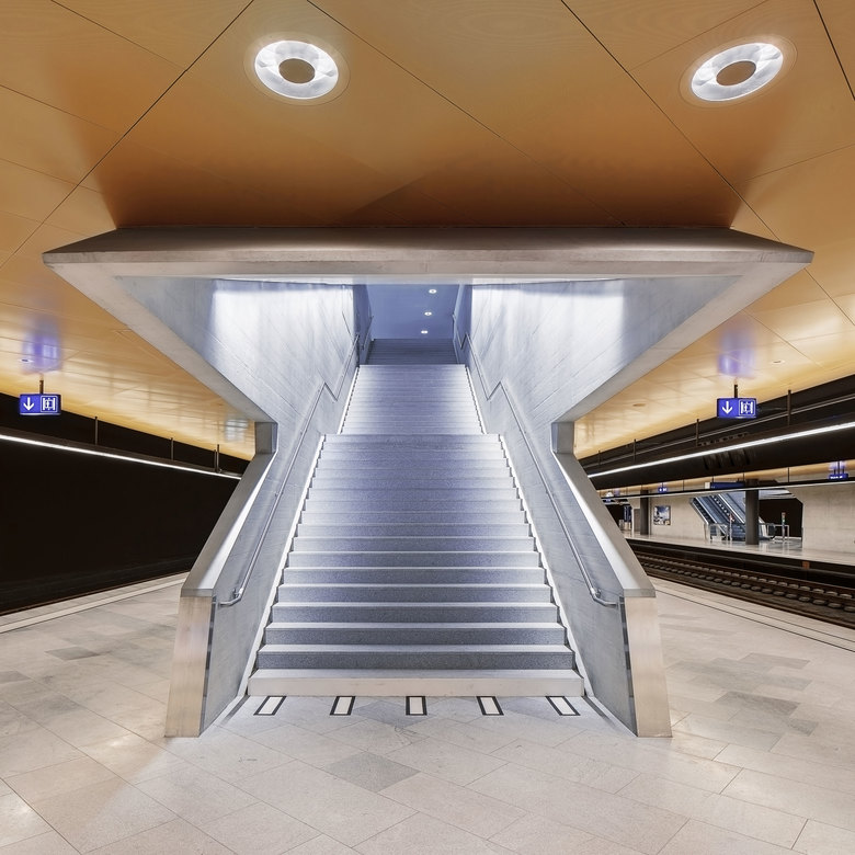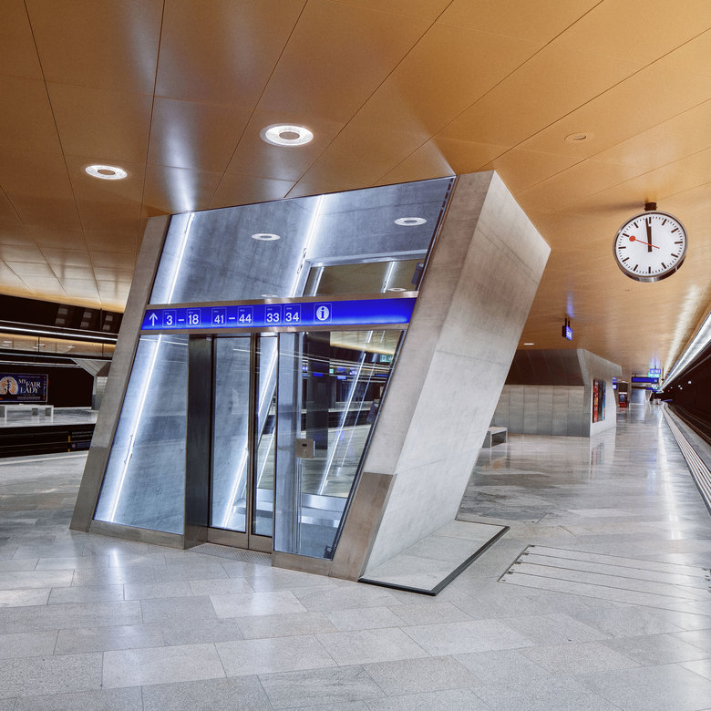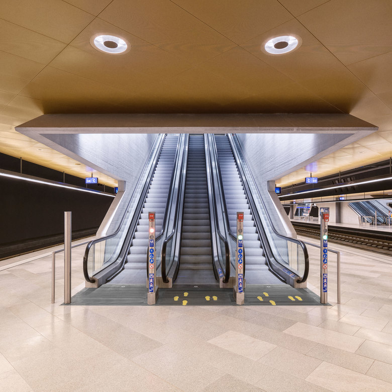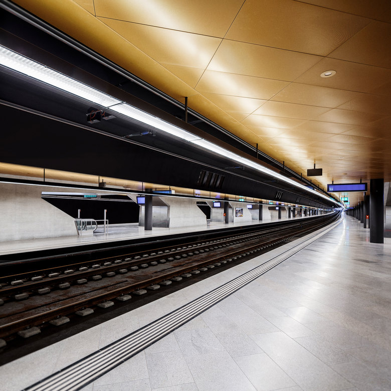 Die Absicht der Lichtplanung bestand darin – neben der Besucherführung und Orientierung als wichtigste Materialisierungsparameter – die Shopping- und Durchgangsfläche an das Tageslicht anzupassen. Hell und annähernd klinisch wurden sie gestaltet, während sich das Perrongeschoss in eine erdigere wärmere, fast goldene Umgebung einhüllt.