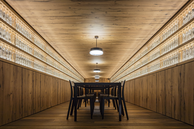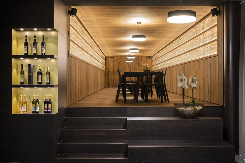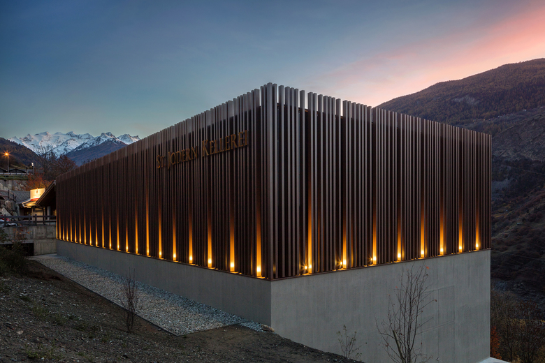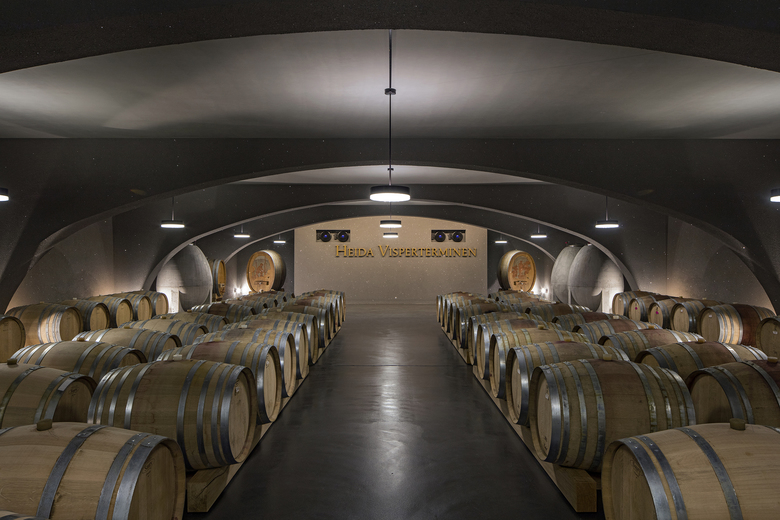 Die St. Jodern Kellerei liegt inmitten der imposanten Oberwalliser Berglandschaft. Das Beleuchtungskonzept für den dreigeschossigen, auf einer Hangschulter thronenden Erweiterungsbau zeugt von Einfachheit und Prägnanz. Speziell entwickelte Pendelleuchten mit massiven, gegossenen Glasabdeckungen erhellen das markante Gewölbe des Barrique-Keller wie auch den angrenzenden Loungebereich und bilden in ihrer Materialität und Haptik eine Reminiszenz an die edlen Weinflaschen. Eine kleinere, als Wandleuchte ausgebildete Version erzeugt eine dezente, warme Hinterleuchtung der massiven Eichenfässer. Im neuen Eichensaal schafft ein Kunstwerk aus über 1500 Weinflaschen eine einmalige, erhabene Stimmung. Im Aussenbereich unterstreicht der schmale Schein kleinerer quadratischer Glaswürfel die, als Anlehnung eines Rebberges, konzipierte Fassade und lässt deren filigrane Struktur bis weit ins Tal sichtbar erstrahlen.