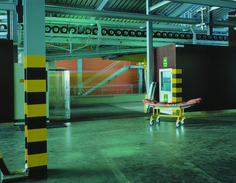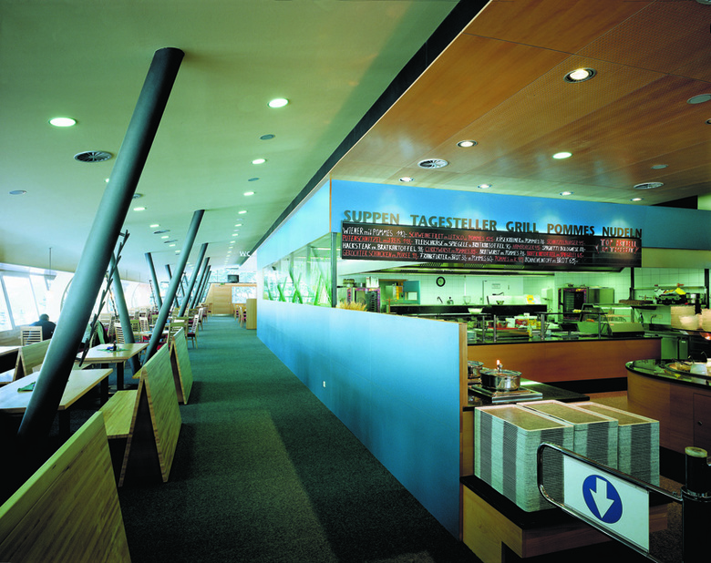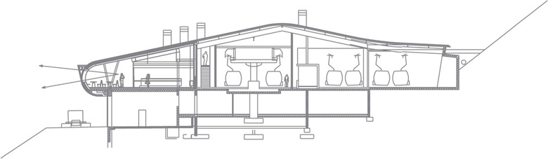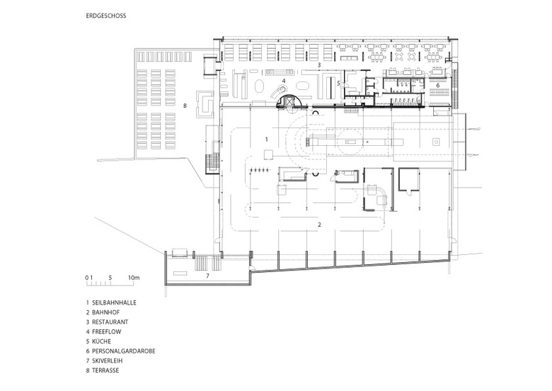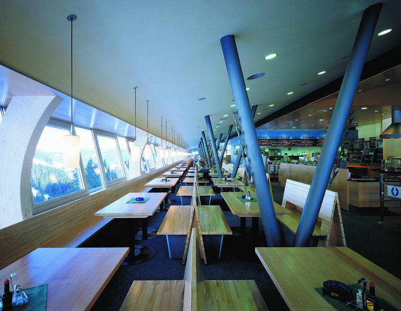 Die Ankunftshalle wurde in Längsrichtung geteilt, zwei Drittel sind dem Seilbahnhof vorbehalten, ein Drittel wurde niveaugleich zum Restaurant ausgebaut, und hinter den Rolltoren des Untergeschosses stehen nun ausreichend Flächen für Werkstätten, Garagen, Serviceräume, Pistenfahrzeuge etc. zur Verfügung.