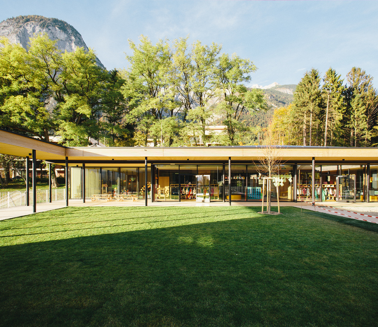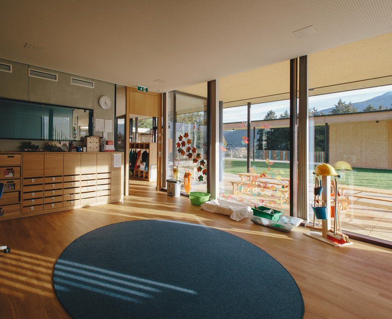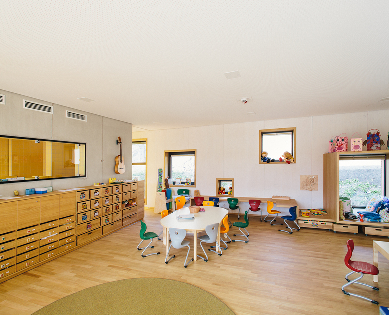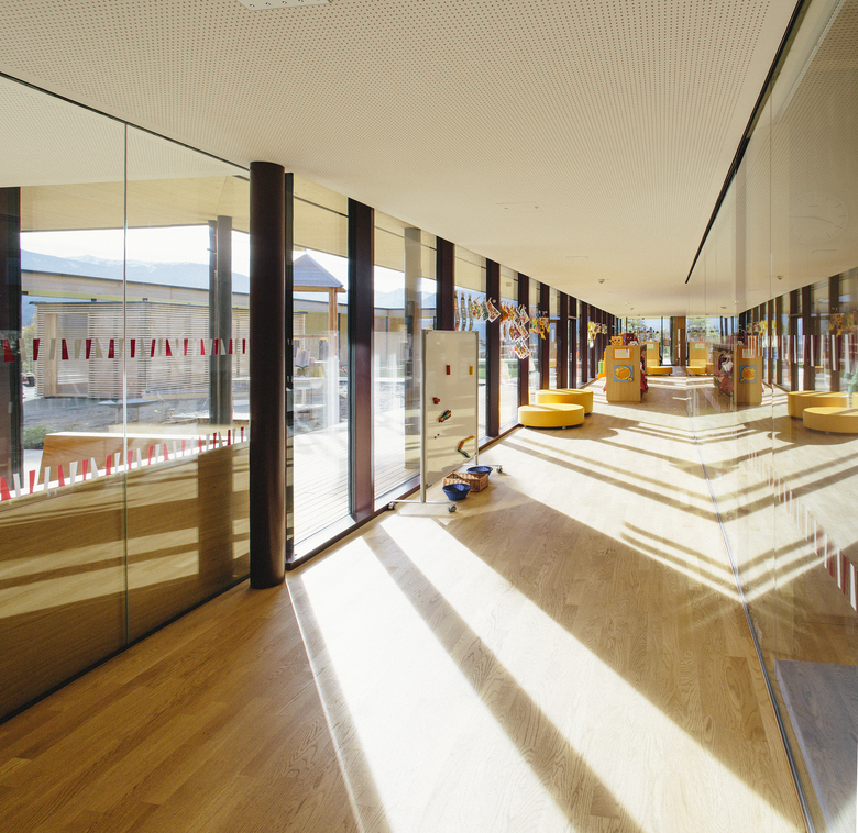 Der überdeckte Außenraum (Terrasse), der verglaste überdeckte Innenraum (Garderobezone), der Gruppenraum mit Glasschiebewand und die Alkoven, Nischen und Wasserspielzonen an der Nordwand. Die Anordnung der Teilungs-, Sanitär- und Gruppenräume nebeneinander ermöglicht vielfältige Nutzungsvarianten von der üblichen Raumeinteilung bis hin zur offenen kontinuierlichen Spiellandschaft.