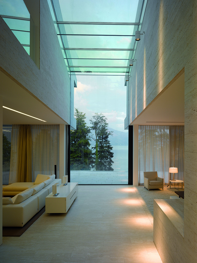 Die Auskragungen dienen als Sonnen- und Wetterschutz, zu¬gleich sind sie als gedeckte und geschützte Aufenthaltsräume im Freien nutzbar. Das Untergeschoss ist als zurückversetzte «Fuge» vom See her sichtbar und betont damit die Horizontali¬tät der prägnanten Geschossplatten. Das Dach ist als zurück¬haltend, flachgeneigtes Walmdach konzipiert.