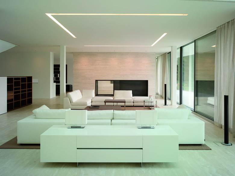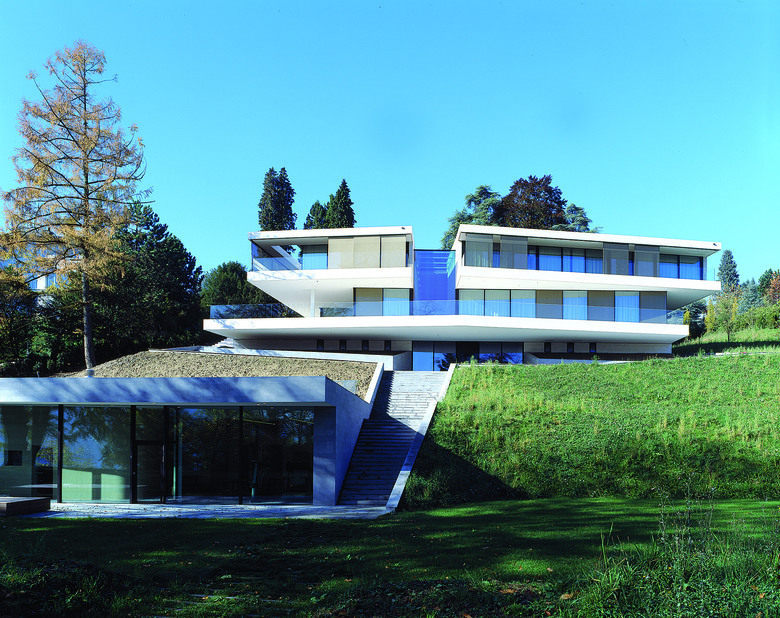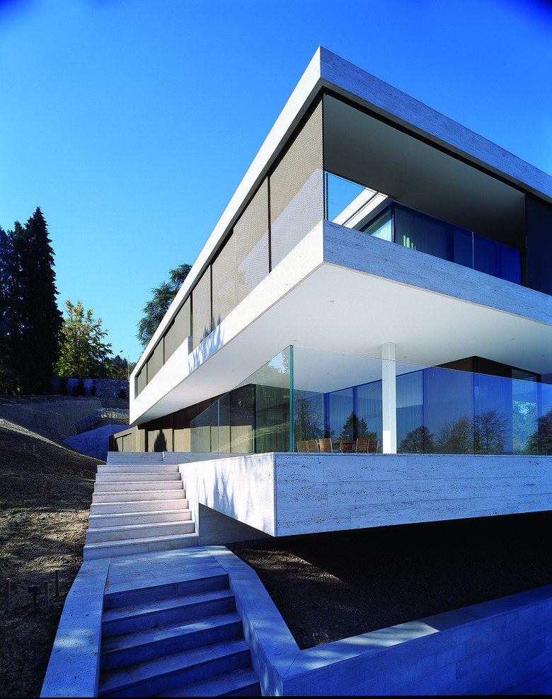 Die Residenz ist dreiteilig, wobei die Villa in der Mitte des Grundstücks platziert ist und die Einstellhalle, sowie das separate Poolhaus als „Geländeaufklappung“ konzipiert sind. Vom grosszügigen Hof, der zwischen Villa und Einstellhalle liegt, betritt man das Wohngebäude.