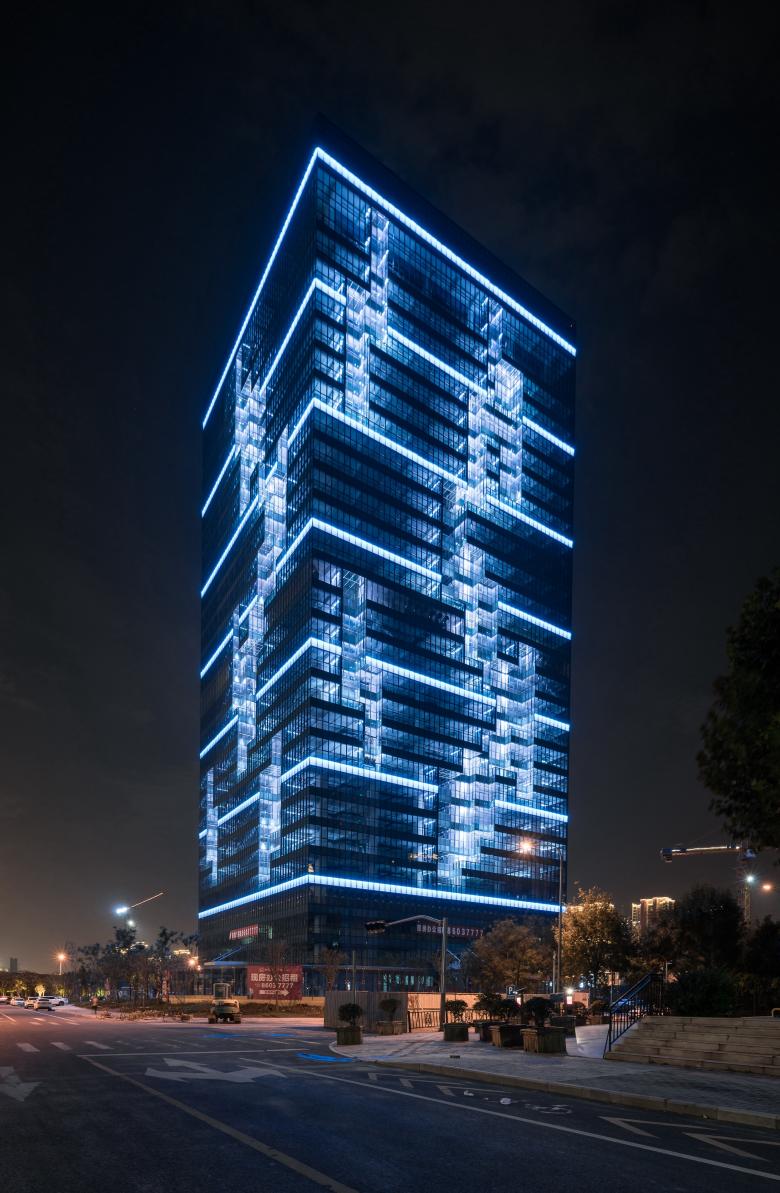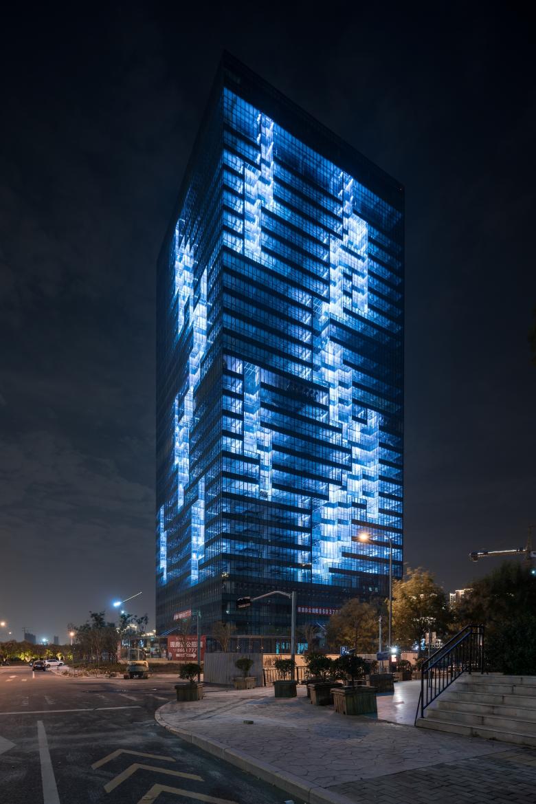 At night, it transforms into an illusionary figure. The horizontal bands of light that reveal the stacked atrium and the vertical light that reveals the "cracks" gradually change to blue and purple, creating a futuristic impression like that of a science fiction world. Locals call this undulating "cracks" "like a rising dragon.