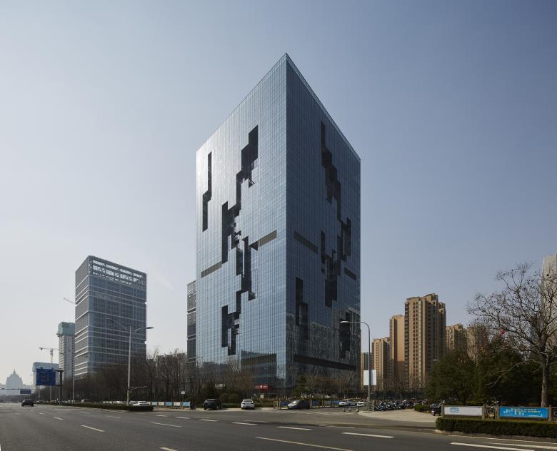 The 29-story office building with a maximum height of 126 m is located in the development zone around the new high-speed railroad station. 500% floor area ratio and economic rationality have led to the adoption of twin towers in the surrounding areas with the same conditions. The 54.4 m square plan is the square root of 3,000 m2, which is a critical measure for area zoning.