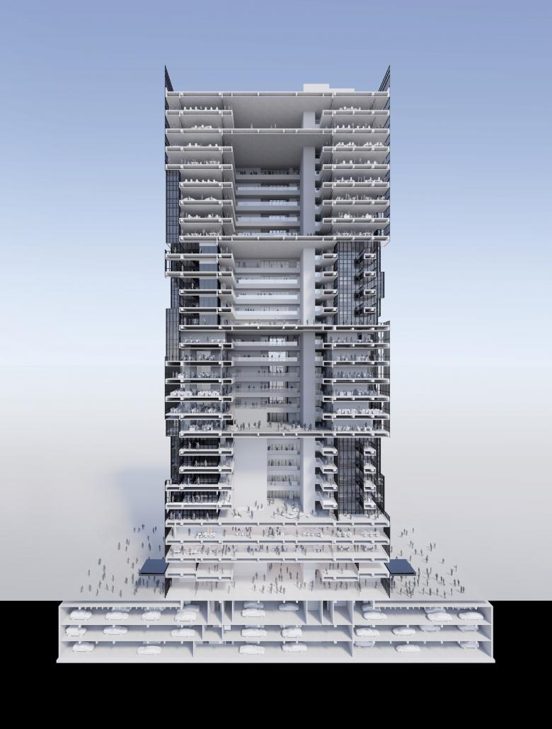 This large square plane encompasses a 27m square atrium, which is vertically stacked from ground level with two, five, six, five, six, and two tiers of atriums. The first two-level atrium is the entrance hall and retail atrium. The atrium above it is the common office space, with elevator banks located at the four corners of the atrium providing individual access to each. The office space surrounding the atrium is planned in such a way that a single company may occupy it exclusively or many companies may share it.
