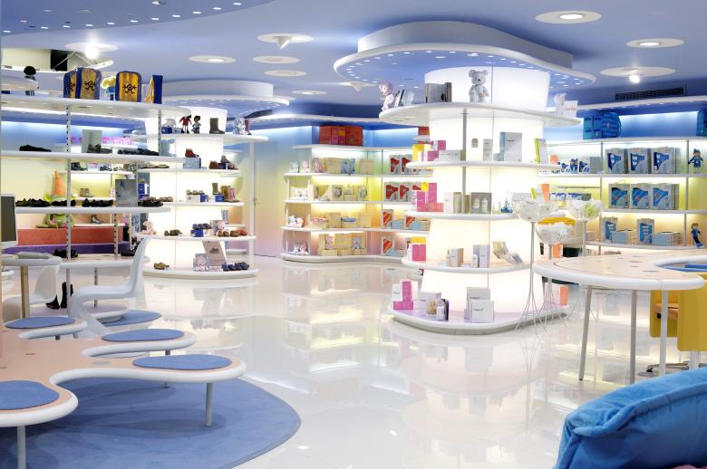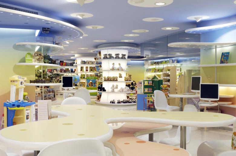 The products and their packaging often use primary colors. To enhance this use of color and to add vibrancy to the space, the walls are rainbow-colored. The vertically graduated rainbow wallpaper is custom-made, hoping to give children the sensation of being enveloped in a rainbow.
