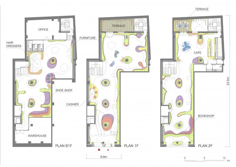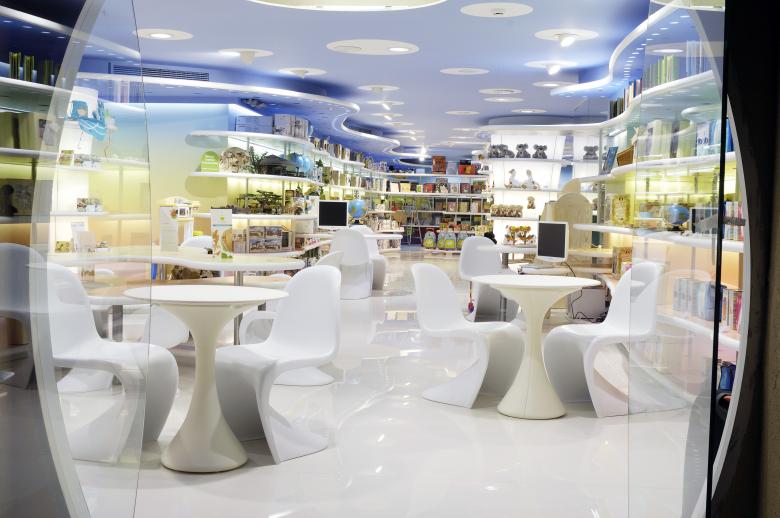The five levels of display shelves have smooth, curving lines, mimicking the natural terrain with contour lines. Locally, parts of the shelves protrude like "tongues," transitioning into displays for promotional items, area signs, tables, chairs, counters, bookshelves, and partitions, creating a variety of activities.