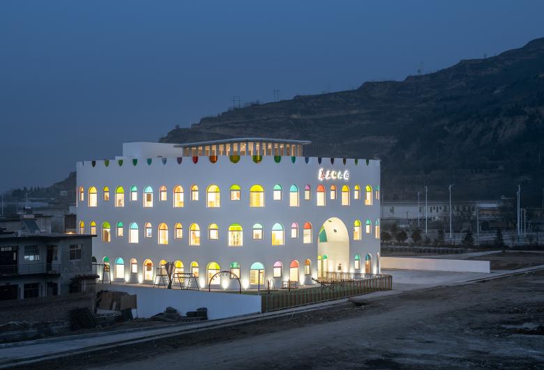 The second feature is that all the openings in the kindergarten are arched. The traditional cave-like form of dwelling in the Loess Plateau, where Tianshui City located, inspires the idea of the arch. To practice the concept, the team arranges the arched windows in different sizes with scattered positions, making this building looks like a birthday cake.