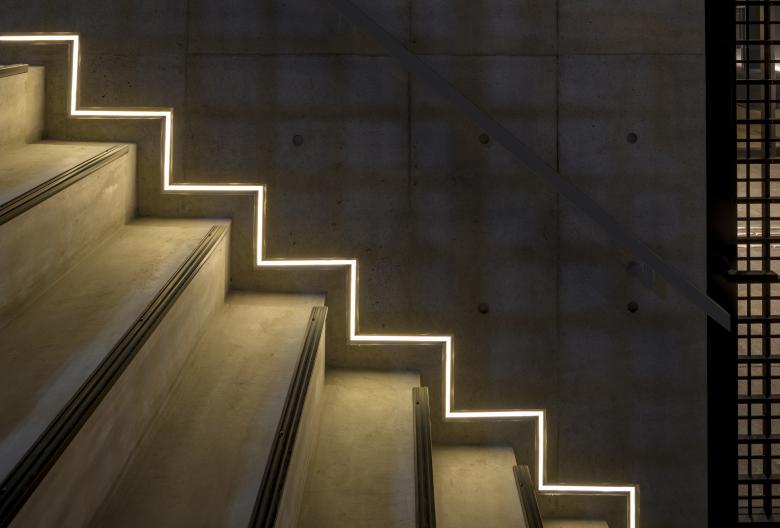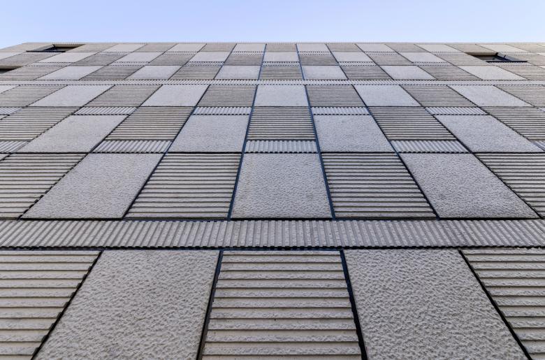For the adjacent residential building, the north elevation of the building is a "scenery" that will exist for decades to come. In order to soften the oppressive feeling created by the 20-meter-long fair-faced RC wall, the elevation is scaled down by dividing it into 875-mm squares. In addition, three types of formwork were used to create an uneven surface: "vertical stripes," "horizontal stripes," and "undulate" formwork. The checkered pattern will gradually become clearer due to the difference in the speed of the blackening. The elevation will become a "scenery" that changes continuously.