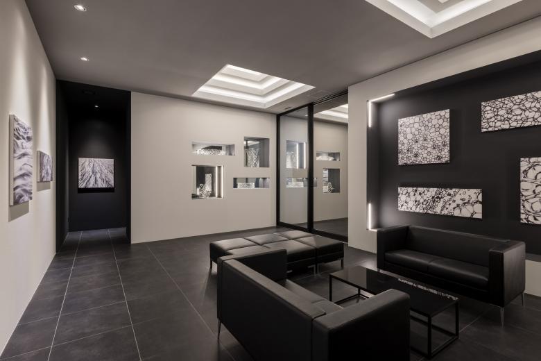 Monochrome – The ground floor exterior finish uses raw concrete with cedar boards, serving as a base for the white volumes above. The tip of the sharply angled site is shaped like the bow of a ship, and cherry trees are planted at the second floor level, providing a soothing visual from the intersection. The entrance hall is located at the end of a tunnel-like approach dug into the base, crafted into a sharp-edged, gallery-like space unified in black and white. The curation of twelve paintings themed on water and life and four sculptures made of tin are also the architect’s creation. The building, detailed entirely in "monochrome," has become a new landmark embodying a refined lifestyle.