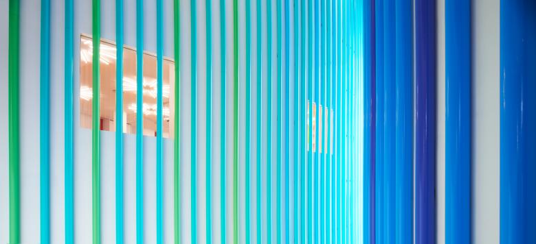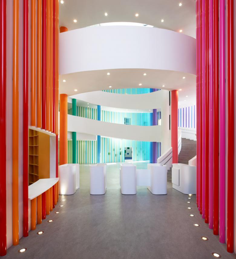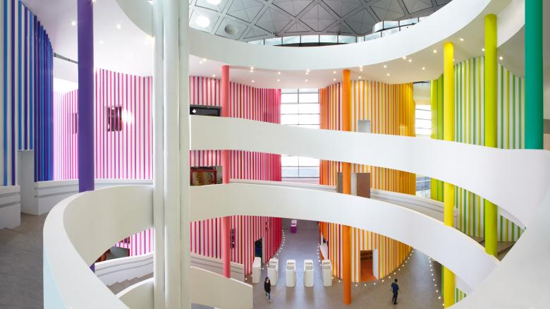 Connecting these rooms is a gently sloping ramp that spirals upward to a height of 10 meters, following the colorful poles. Children traverse this ramp as they move from one room to another, discovering new activities along the way. The striking views of the atrium that greet them at every turn immerse the children in an extraordinary, fairy tale-like atmosphere.