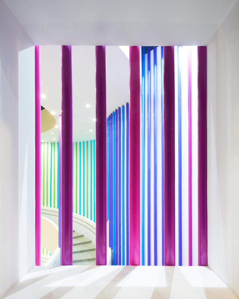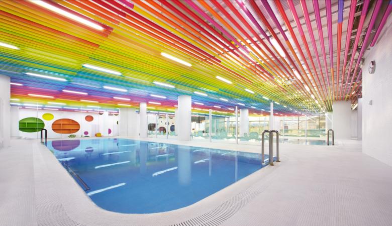 In the basement pool area, vibrant colors have been applied to the ceiling louvers, creating the impression of swimming beneath a rainbow. This design aims to evoke a sense of wonder and joy for the children.