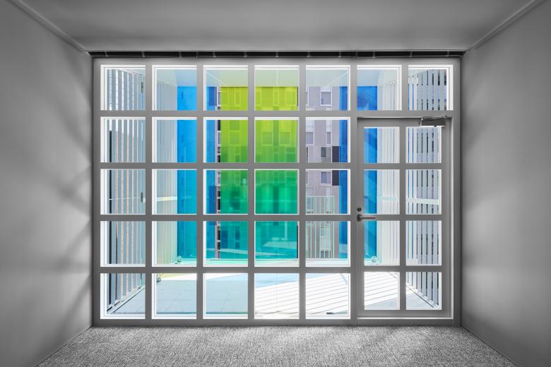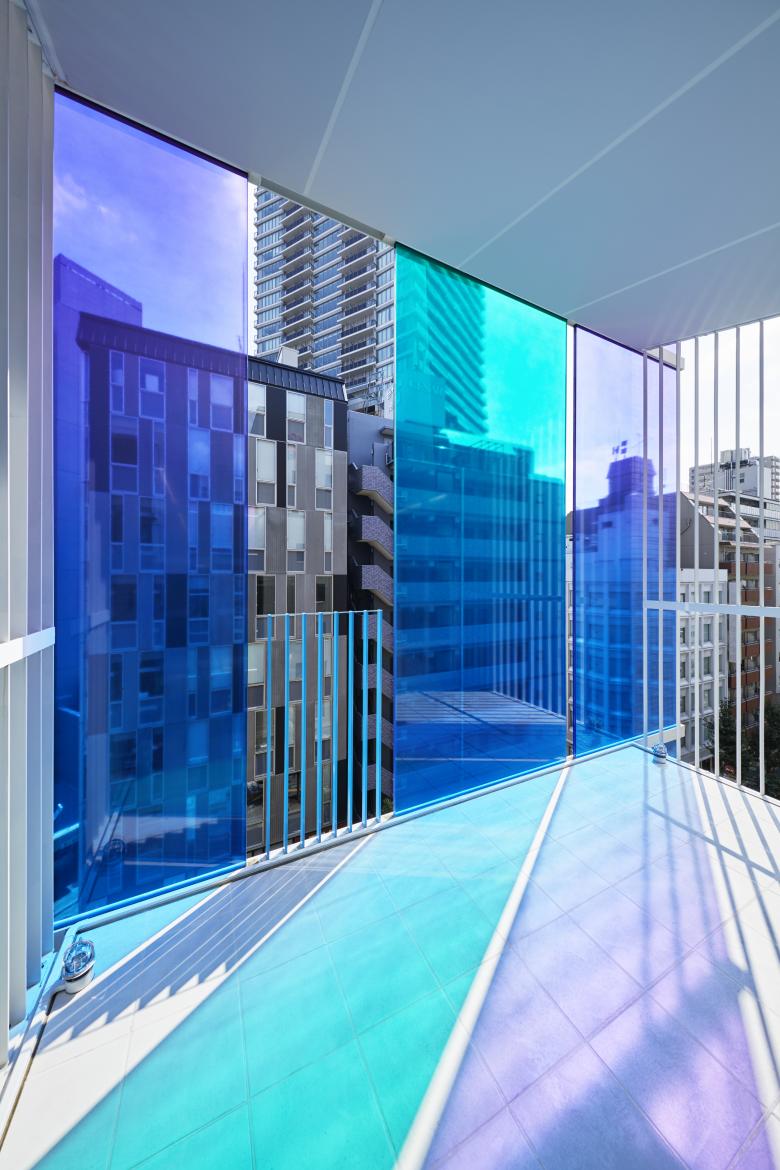 Direct daylight is converted into colorful light through the colored glass, creating beautiful shadows on the terrace floor and on the exterior walls of the adjacent buildings.
