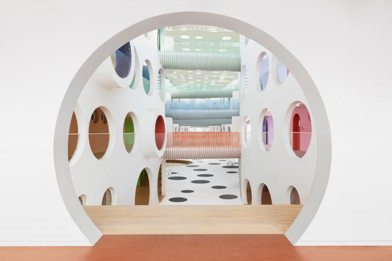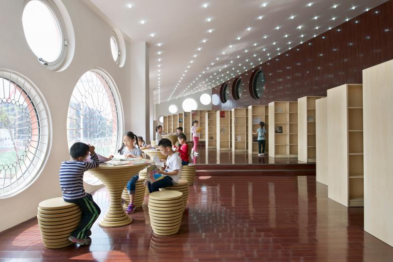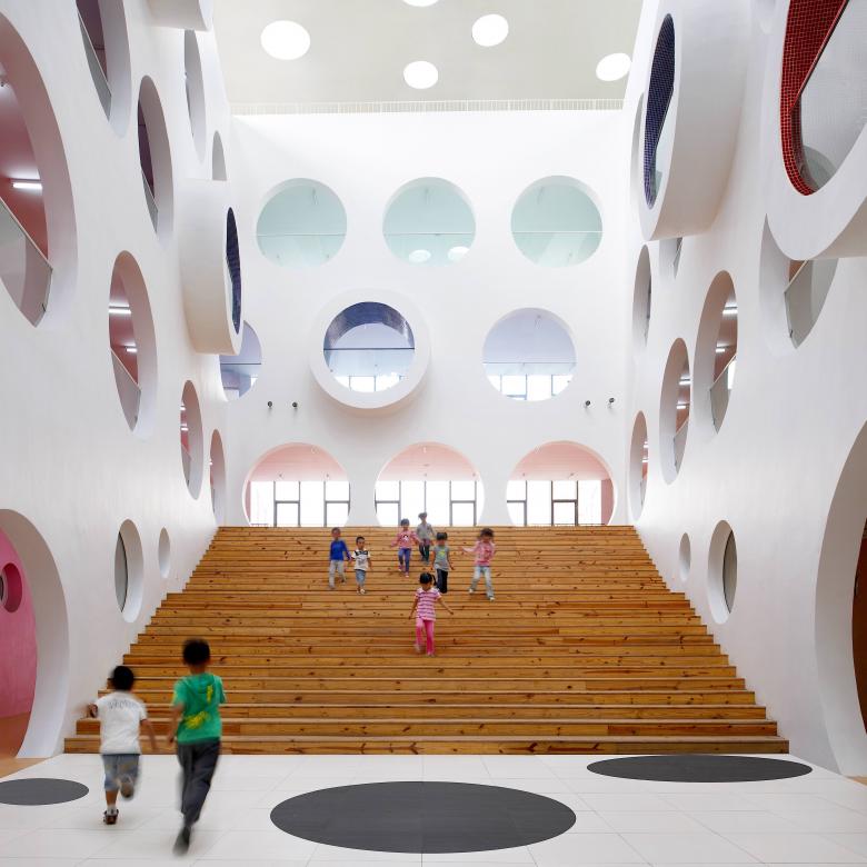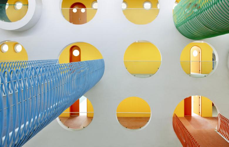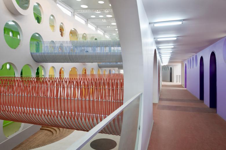 The elementary school consists of eight volumes that house the regular and special classrooms. These volumes are divided into four levels and arranged in a zigzag pattern. To connect the classrooms across the corridors, twelve bridges are suspended at various angles between the facing volumes. Each volume and each floor has a different color, creating 32 distinct places with diverse combinations. This adds variety and identity to the school architecture, like the 32 team colors.