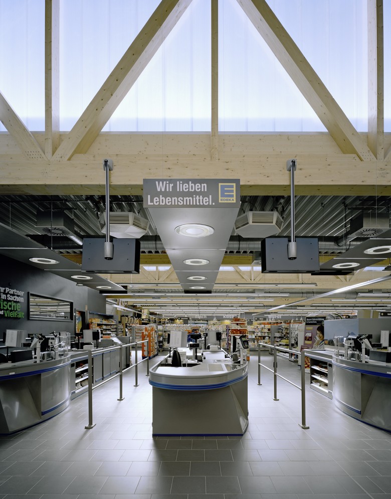 Mit der Planung des Supermarktes in Wangen wurde ein Konzept entwickelt, das möglichst wenig Energie, sowohl in der Herstellung als auch im Betrieb, verbraucht. Als Vorbild für das Markt- und Belichtungskonzept dienten Wochenmärkte und Markthallen.