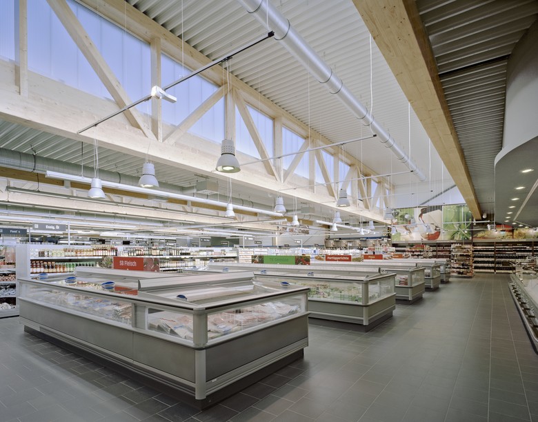 Der Lebensmittelmarkt mit Grundrissabmessungen 40 m x 60 m und 7,50 m Höhe ist eingeschossig und nicht unterkellert. Die Primärkonstruktion des Daches besteht im Nebenraumbereich aus konventionellen Brettschichtholzträgern. Über dem großen Verkaufsraum spannen Fachwerkbinder aus Holz stützenfrei über 34 m. Die Kopplung der Hauptträger erfolgt ausschließlich über die Trapezblecheindeckung, welche, als Schubfeld ausgebildet, die Horizontalaussteifung in der Dachebene bildet. Über die großflächige transparenten Mehrkammer- polycarbonatplatten an den Fachwerk-bindern wird der Markt hervorragend mit Tageslicht versorgt. Die Gründung erfolgt mittels eines Trägerrostes und Magerbetonplomben im tiefliegenden, tragfähigen Arietenkalk.