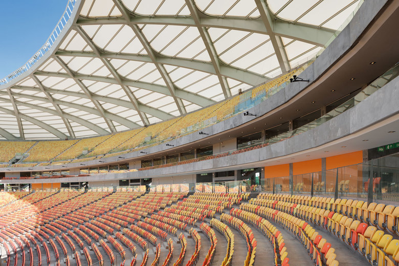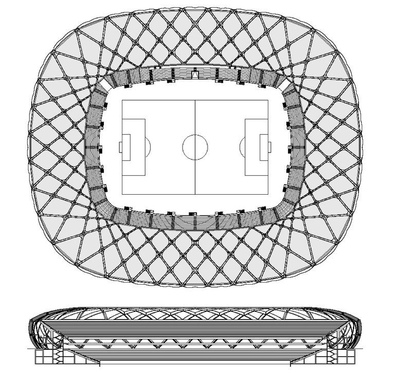 Das primäre Tragwerk kann der Gruppe der Gitterschalen zugeordnet werden. Statisch- konstruktive Herausforderungen ergeben sich vor allem durch die große Öffnung über dem Spielfeld und dem bewusst scharfen Knick zwischen Dach und Fassade. Um große Auflagermomente zu vermeiden, wurde eine gelenkige Lagerung an den Fußpunkten realisiert. Das statische System funktioniert dann nur mit einem Druckring am Dachinnenrand und einem Zugring am Dachaußenrand. Durch deren Zusammenspiel kann das Kragmoment mittels eines horizontalen Kräftepaars aufgenommen werden. Verschweißte Stahlhohlkästen sind für Transport und Montage modular hergestellt, die schlanken Stege zusätzlich durch Steifen gegen Beulen ausgesteift. An den Kreuzungspunkten der Träger sind die Blechstärken so weit erhöht, dass die räumlichen Spannungszustände aufgenommen werden können. Die Dach und Fassadenhaut besteht aus hochfester und dauerhafter PTFE beschichteter Glasfasermembran. Eine Sekundärstruktur in Rautenform wirkt mit nur sehr geringer Vorkrümmung der eingehängten Pfetten für die Membran als Rahmen und Unterstützung.