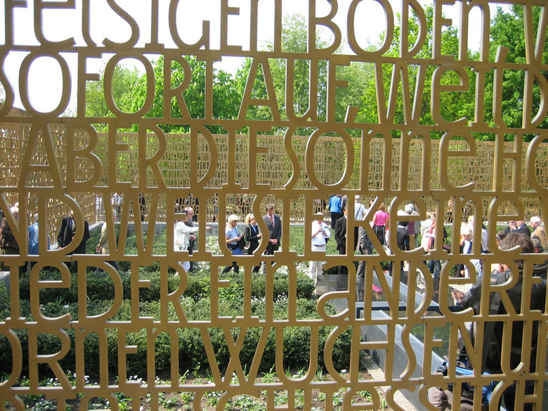 Der "Christliche Garten" gehört zu den "Gärten der Welt" im Erholungspark Berlin-Marzahn. Seine Form symbolisiert einen klösterlichen Kreuzgang auf quadratischem Grundriss, umgeben von einem orthogonalen Wandelgang. Für den Entwurf dieser Pergola suchten die Landschaftsarchitekten ein minimalistisches Tragwerk, welches die Buchstaben christlicher Zitate in Wände und Decken integriert. Es entstand ein räumliches Rahmentragwerk aus Aluminiumguss, in dem Hülle und Buchstaben eine tragende Einheit bilden. Die einzelnen Guss-Teilsegmente sind durch Schweiß-, Schraub- und Steckverbindungen miteinander verbunden.