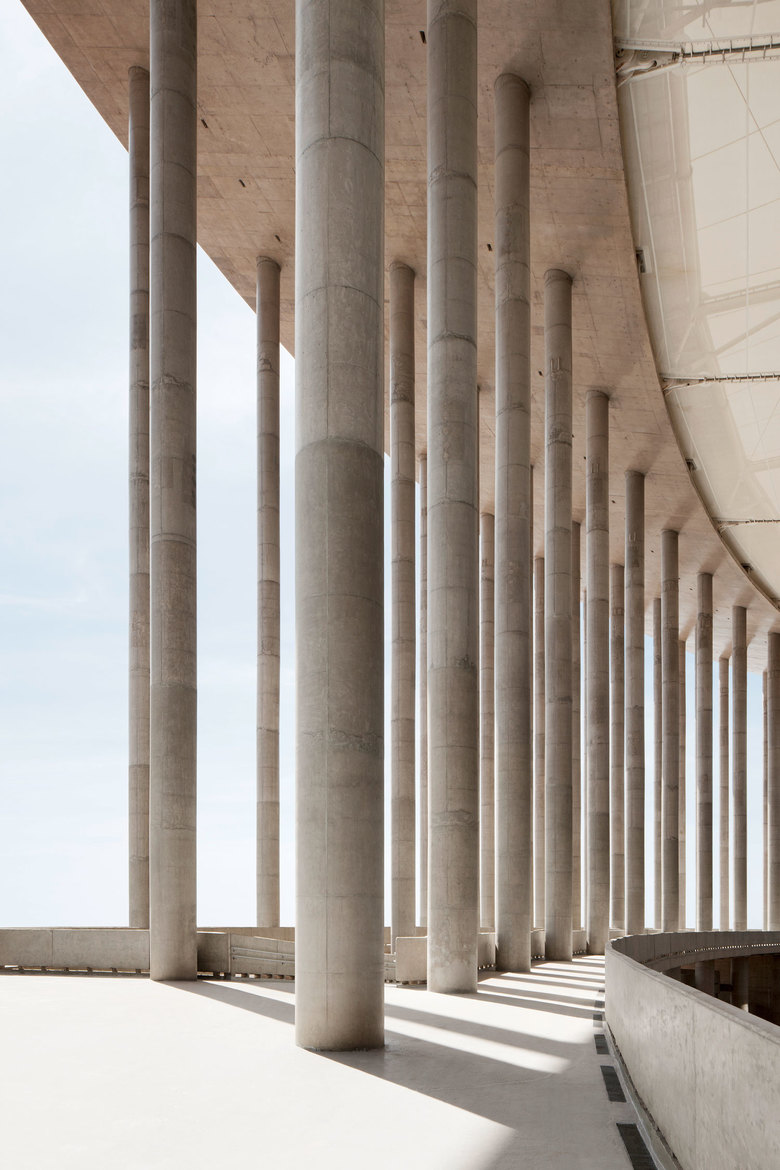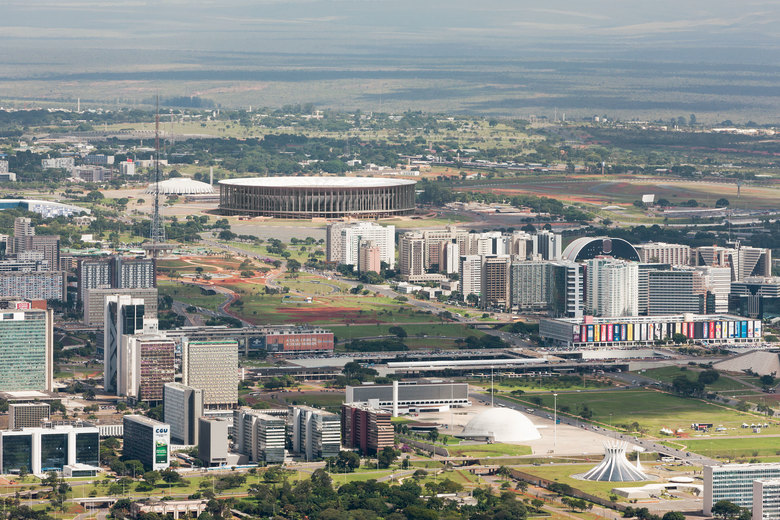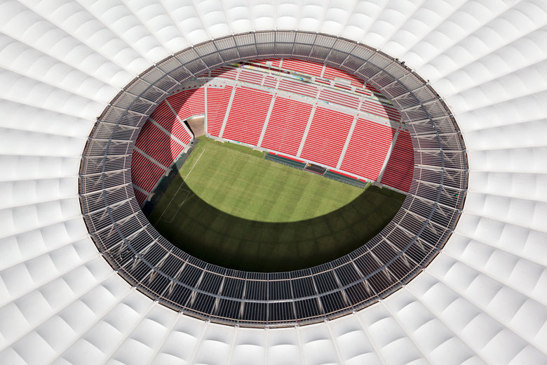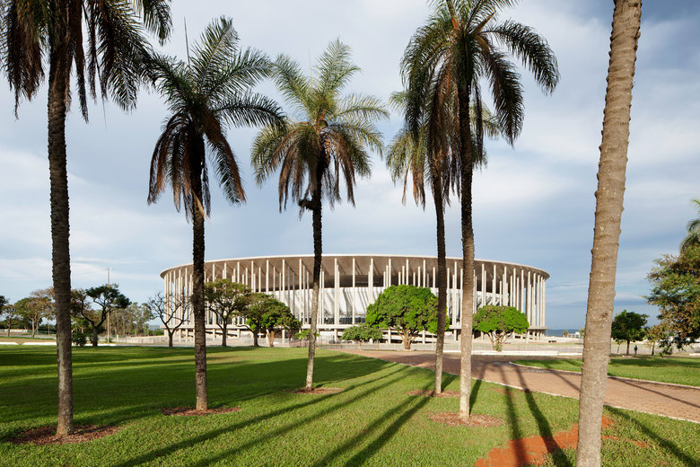 Die brasilianische Hauptstadt, gerade 50 Jahre alt geworden, steht auf der Liste des Weltkulturerbes der UNESCO. Gleichwohl ist Brasília für Bauingenieure und Architekten so etwas wie der „heilige Boden“ der Moderne. Die Architekten von gmp und die Ingenieure von schlaich bergermann und partner gemeinsam mit Castro Mello Architekten und Luis Pitta ETALP Ingenieuren empfanden es als große Ehre Teil des Teams zu sein, das dem Ensemble von Costa und Niemeyer ein weiteres monumentales Bauwerk hinzufügen durfte. So entstand in der Tradition von Brasilia ein neues multifunktionales Stadion. Das Wechselspiel zwischen Rampen, Brücken, langen schlanken Stützen und dem monumentalen kreisrunden Dach, das weit über die Stadionschüssel hinaus reicht, sind charakteristisch für den Entwurf. In Verbindung mit dem innerhalb der starken Betonstruktur schwebenden leichten Membrandach ist hier ein außergewöhnliches und dem Standort angemessenes Bauwerk entstanden. Das Nationalstadion in Brasilia wurde seit 2010 modernisiert, um den Voraussetzungen als Spielstätte der FIFA WM 2014 gerecht zu werden. Am 18.05.2013 konnte das erste Spiel unter dem neuen Dach stattfinden. Im Nationalstadion in Brasilia wird neben Vor- und Zwischenrundenspielen auch eines der Halbfinale der FIFA Weltmeisterschaft stattfinden.