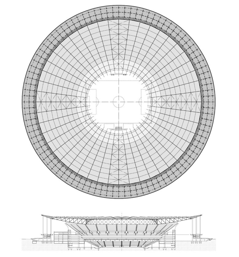 Die Stahlbetonstruktur für das Stadiondach umfasst die Esplanade, den Stützenkranz aus 288 Betonstützen sowie den Betondruckring des Ringseildaches. Die gesamte Struktur basiert auf einer perfekten Kreisgeometrie und entwickelt sich aus 96 radialen und 3 tangentialen Ringachsen der Betonstützen. Die 288 Betonstützen sind bis zu 61 m lang und mit 1,2-1,5 m Durchmesser extrem schlank ausgebildet. Der 22 m breite keilförmige Betondruckring hat einen Außendurchmesser von 309 m und in seinen radialen Wänden sind die hohen Zugkräfte der Seilkonstruktion mittels Litzenbündel sicher verankert. Das Hängedach besteht aus einem Seilnetz von 48 radialen Seilen, die den Druckring mit dem Zugring verbinden. Darauf aufgeständert stehen die schlanken, radialen und tangentialen Fachwerkbinder die untereinander fugenlos durch die gelenkig angeschlossenen Membranbögen stabilisiert sind. Der gesamte Dachkörper ist eingehüllt in PTFE Glasfasermembran Membran.