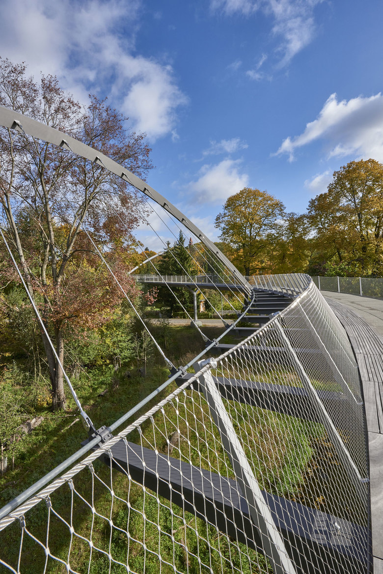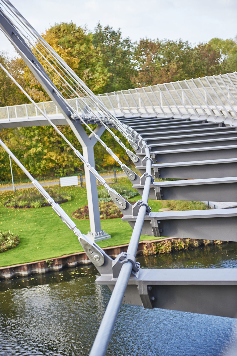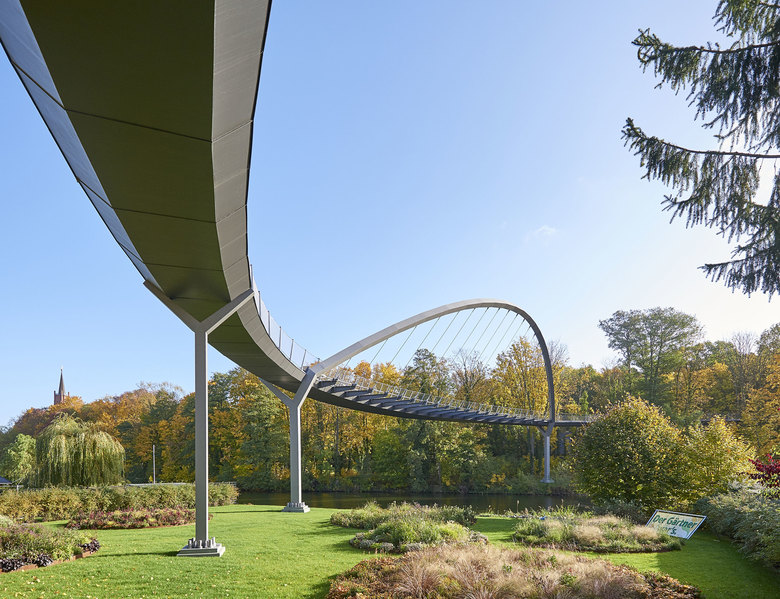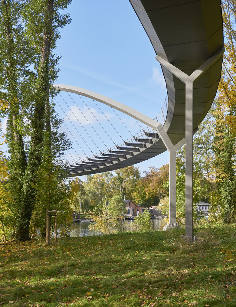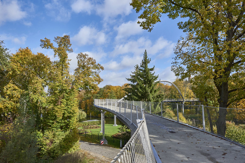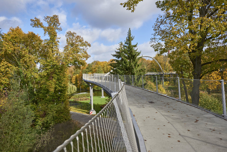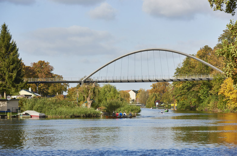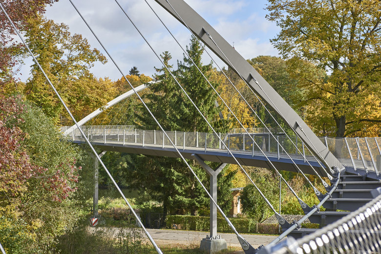 Die neue Fußgänger- und Radwegbrücke schwingt sich S-förmig vom Weinberg-Park über die Havel zum Optikpark. Im Bereich der größten Spannweiten über Fluss und Nebenarm wird der Überbau einseitig durch geneigte Stahlbögen gestützt. Die Hänger werden nicht wie gewöhnlich am äußeren Rand des Kreisringträgers angeschlossen, sondern an radial angeordneten Kragarmen, die fast bis zur Bogenebene führen. Dadurch neigt sich die Resultierende der Hänger nur ein wenig aus der geneigten Bogenebene, wodurch die Biegebeanspruchung des Bogens reduziert wird. Die Bögen enden auf Höhe des Überbaus und ermöglichen so das Kurzschließen des Bogenschubs durch ein Zugband. Im Bereich der Bögen weitet sich das Brückendeck auf und bietet Platz für Sitzflächen. An den Widerlagern ist das Brückendeck monolithisch mit den Unterbauten verbunden, wodurch ein integrales Bauwerk entsteht.