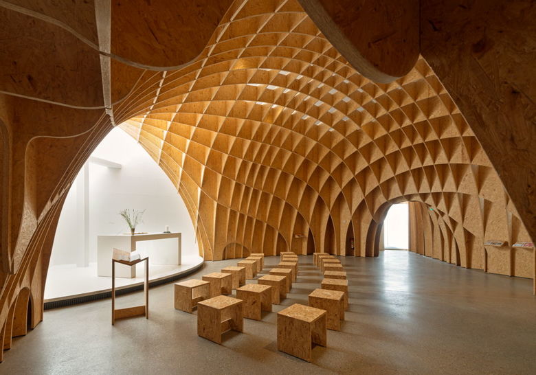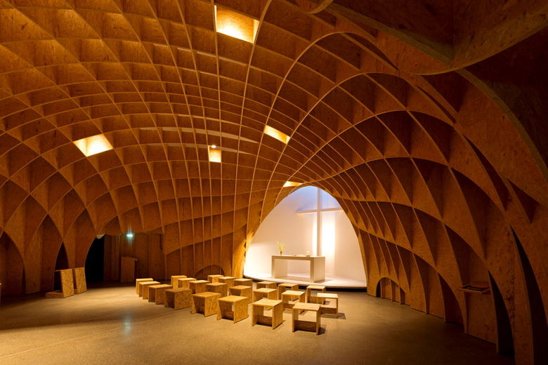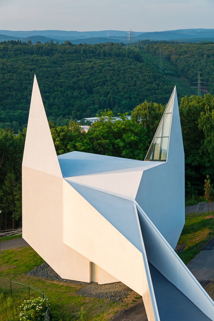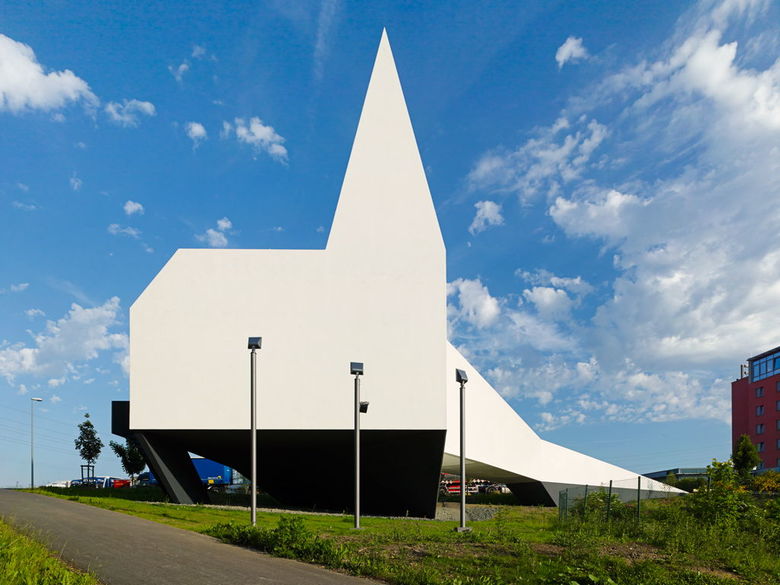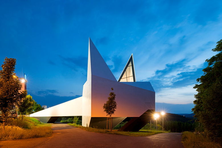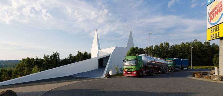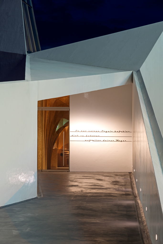 Gestalt – Die dreidimensionale Umsetzung des Kirchen-Piktogramms präsentiert sich sowohl zur Autobahn als auch zum Autohof als stilisierte, weiße Silhouette einer traditionellen Dorfkirche. Man betritt die Kirche, die bei näherer Betrachtung aus dem Berg heraus zu wachsen scheint, über einen Steg, der sich zu einem überdachten Eingang schließt. Im Inneren eröffnet sich ein Raum, dessen Gestaltung in Bezug auf die durch das Äußere hervorgerufene Erwartungshaltung überrascht. Die Innenkuppel öffnet sich zum Altarbereich, in den nur von oben durch die beiden Turmspitzen natürliches Licht einfällt. Das filigrane Holz-Gewölbe zeigt sich ähnlich einer feingliedrigen Kreuzrippen-Struktur.