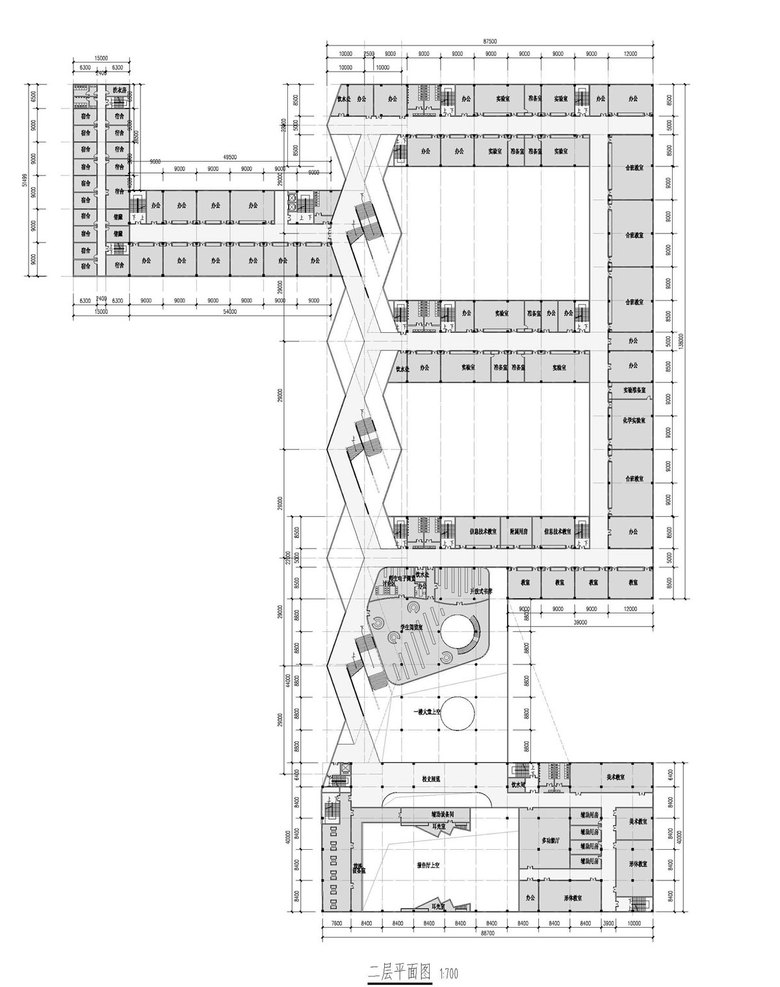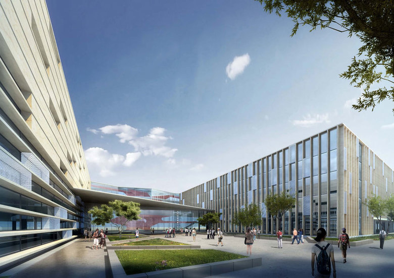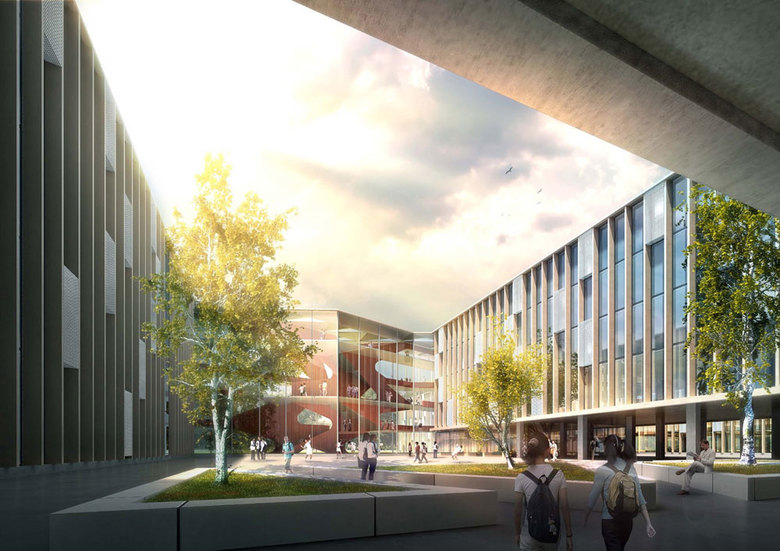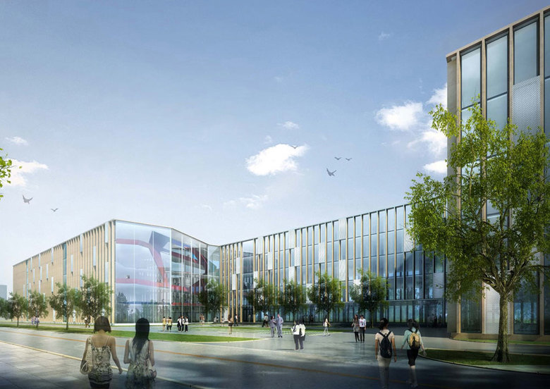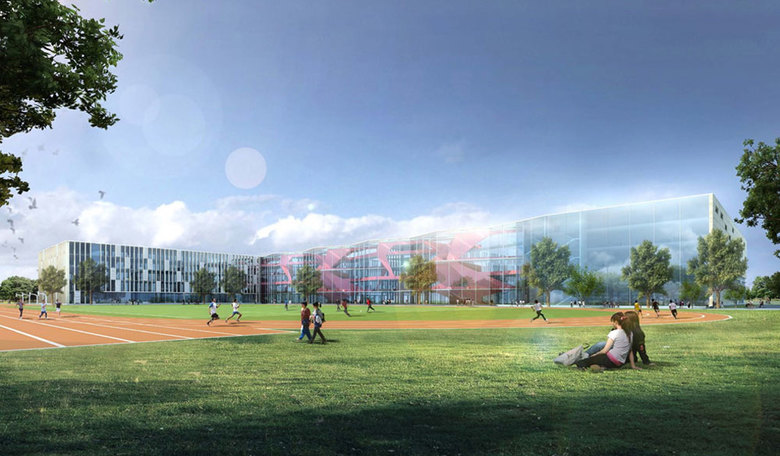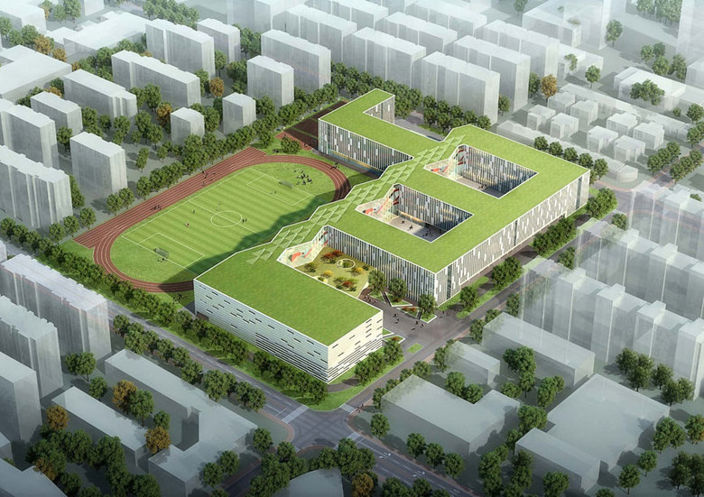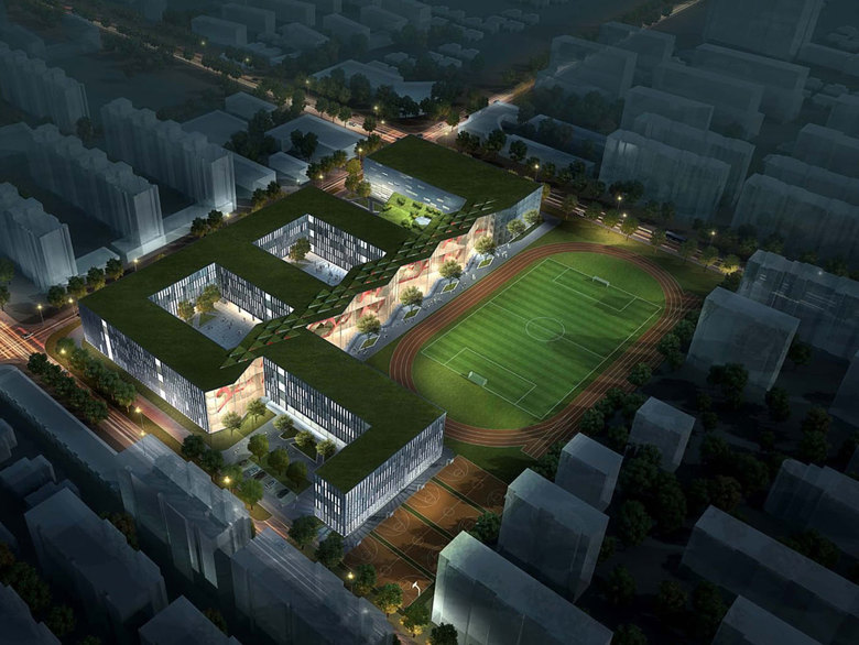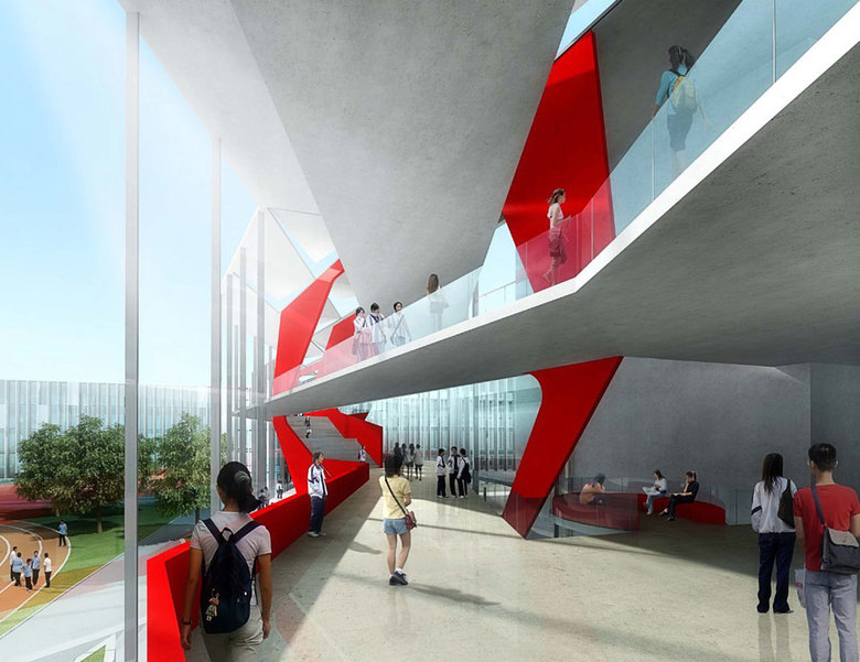 Der Entwurf sieht einen einzigen, fünfgeschossigen Baukörper mit einer Fläche von etwa 63.000 qm vor, der über einen 180 m langen Korridor – das ‚Rückgrat‘ der Schule – alle Funktionsbereiche zentral miteinander in Verbindung setzt. Dieses Rückgrat bietet neben seiner reinen Verkehrsfunktion Aufenthaltsqualität. Es stellt den zukünftigen Schülern damit einen offenen Raum zum alltäglichen, informellen Treffen und Kommunizieren zur Verfügung – ein besonderes Merkmal, das traditionellen chinesischen Schulen fehlt. In den Obergeschossen mäandrieren die Verbindungsbrücken durch die roten Treppenwände hindurch und nehmen dadurch Bezug auf ‚Liu Shang Qu Shui‘, eine überlieferte chinesische Geschichte um das gemeinsame Erdenken, Austauschen und Weitergeben von Wissen. Die Klassenräume für die insgesamt 2.700 Schüler sowie die Mensa, die Bibliothek, eine Aula für 600 Personen und die Sporthalle schließen als klare Baukörper, die den umgebenden städtebaulichen Strukturen folgen, an diesen Korridor an.