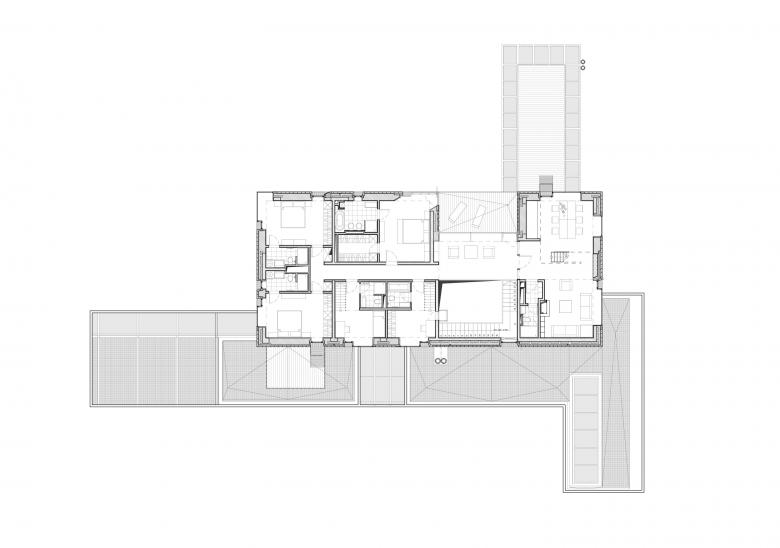 beautiful green plot, the house is moved to its western border. When choosing the location of the house, the movement of the sun through the site and its interaction with the facades and interiors were taken into account.