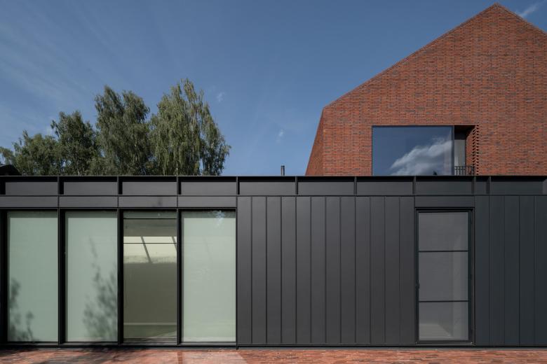 The architectural image was formed on the basis of combining the typology of a country house typical for Europe and Russia and the use of clinker bricks to create its envelope. In addition to the traditional use in exterior walls, Gent clinker bricks from the German Hagemeister factory were used in gable roof (integration of bricks into a fiberboard), slopes, window sills, street ceilings and landscaping. Load-bearing walls are made of large hollow bricks “Paroterm” of the German factory “Wienerberger”, practically without the use of extra insulation. Black metal is also actively used in the decoration of the facades. Single storey outbuildings: carport, garage, food pantry, boiler room, staff quarters, swimming pool and summer barbeque shed are made from it. Interiors actively use wood (floors, walls and ceilings, stairs and built-in furniture), plaster and large-sized porcelain tiles (walls, floors, swimming pool, fireplaces, bathrooms). Facade plastic, especially the location of double-glazed windows in the plane of the brick, taking into account our difficult climate, required an extraordinary solution. I even had to resort to electric heating of the contour of the stained glass structure.