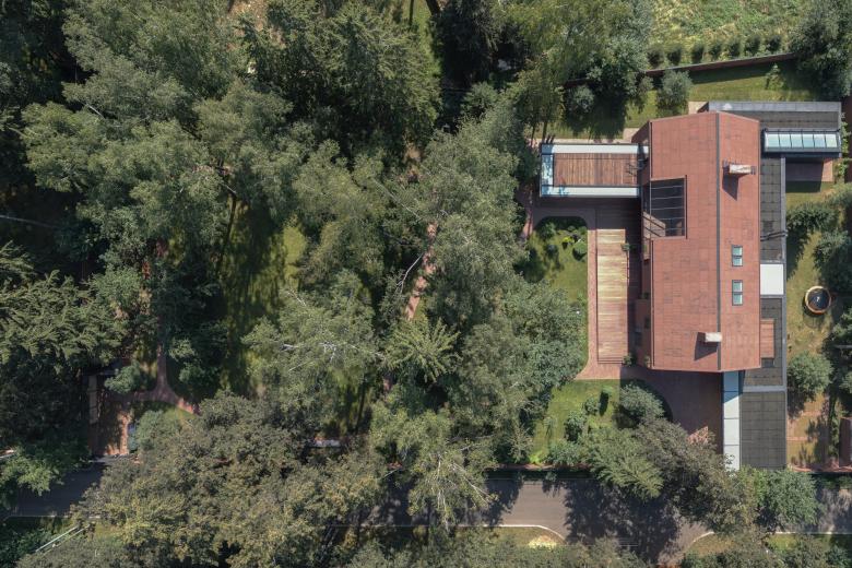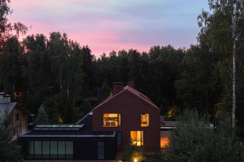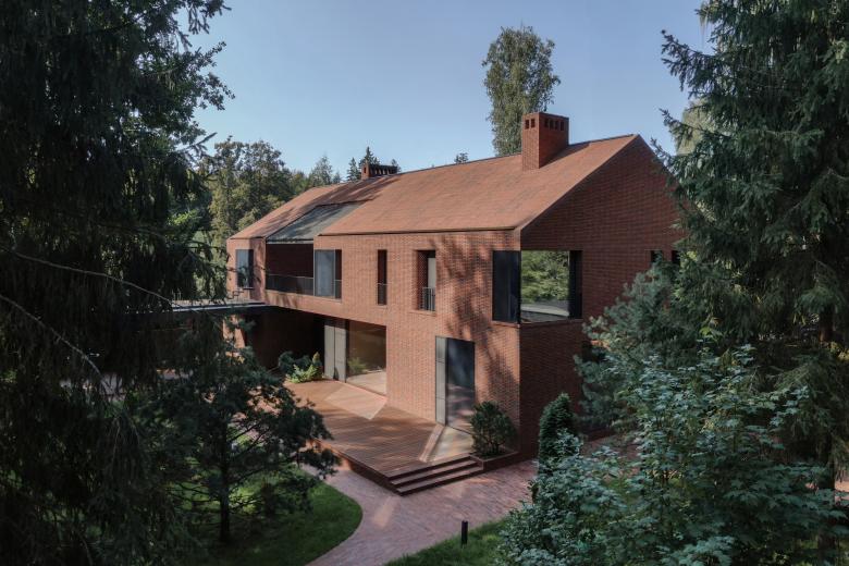The residential building with an area of 650 meters was built in 2021 on a wooded plot of 40 acres in an old writers’ village near the Desna River on the very outskirts of the small town of Troitsk, 17 km southwest of the Moscow Ring Road. Now this territory is part of New Moscow.