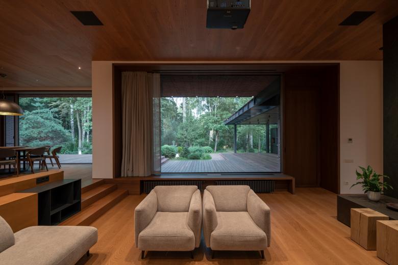 The first floor layout is a enfilade of rooms, the center of which is the large kitchen — dining room, smoothly flowing into the double-height space of the living room — a fireplace. All these rooms are oriented to the site and a beautiful view of nature opens from the interiors through the large windows. Windows are so large that the exterior becomes part of the interior. The location of windows is done in such a way that the building is seen through from all its four sides and from any of its spaces street and forest are visible .