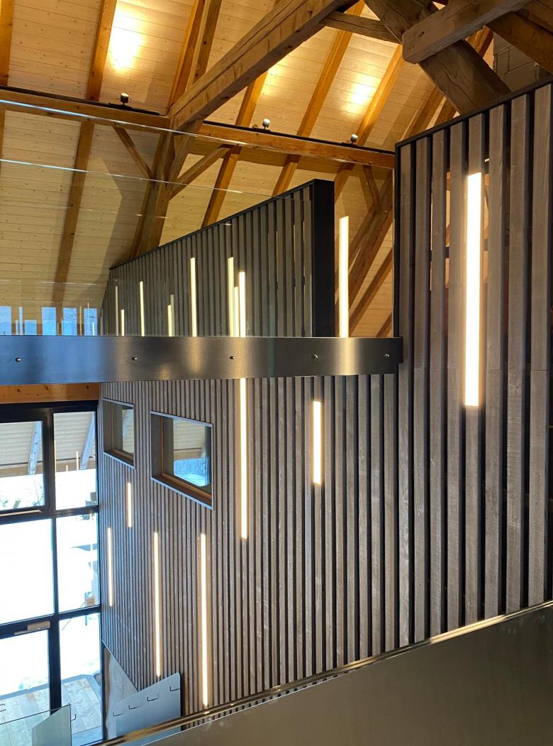 Umbau und Erweiterung eines unter Denkmalschutz stehenden Bauernhaus. Öffnung einer vertikalen Achse und Einbau von wärmegedämmten Kuben im offenen Volumen.