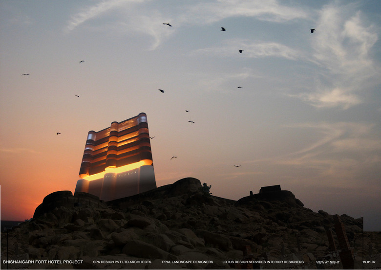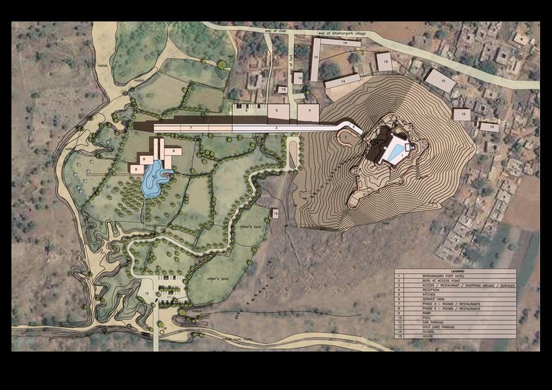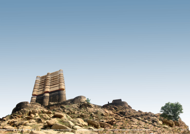 Approach is to keep the fort wall untouched and build a mushroom structure, emerging from within the fort, as a vertical extrusion of the fort. The new structure in layers of stone and glass, would accomodate 24 suites.The old structure accomodates a large convention centre (150 seats).