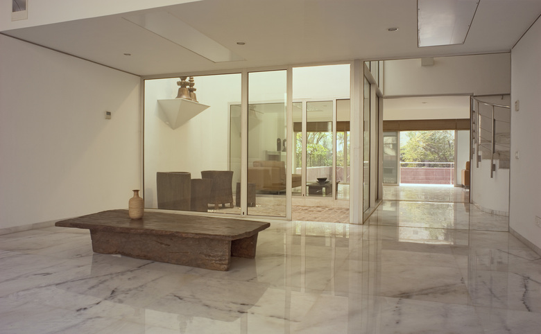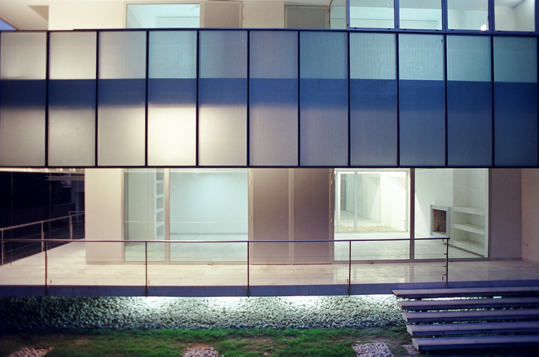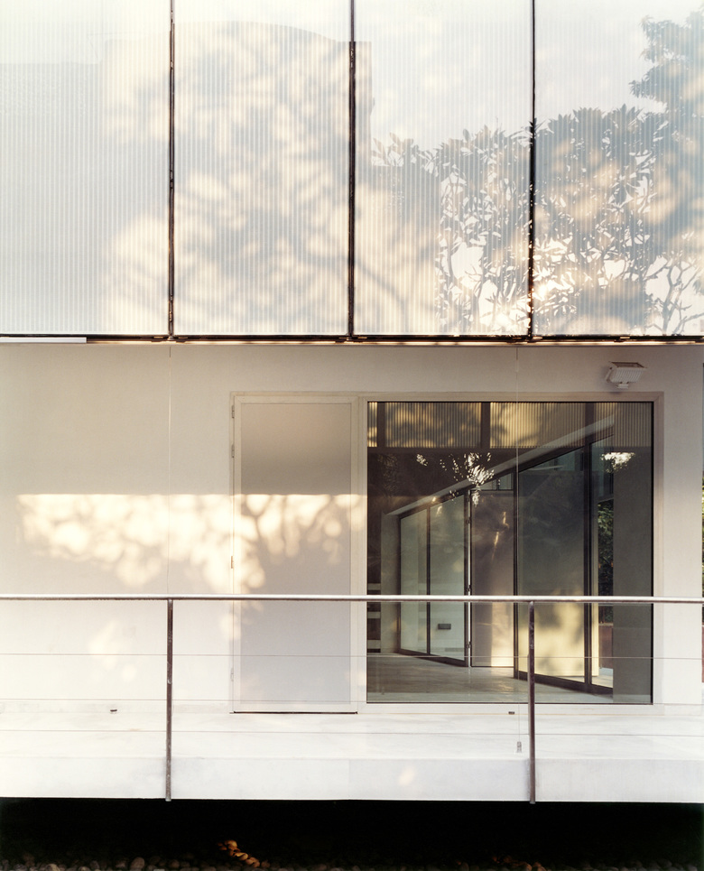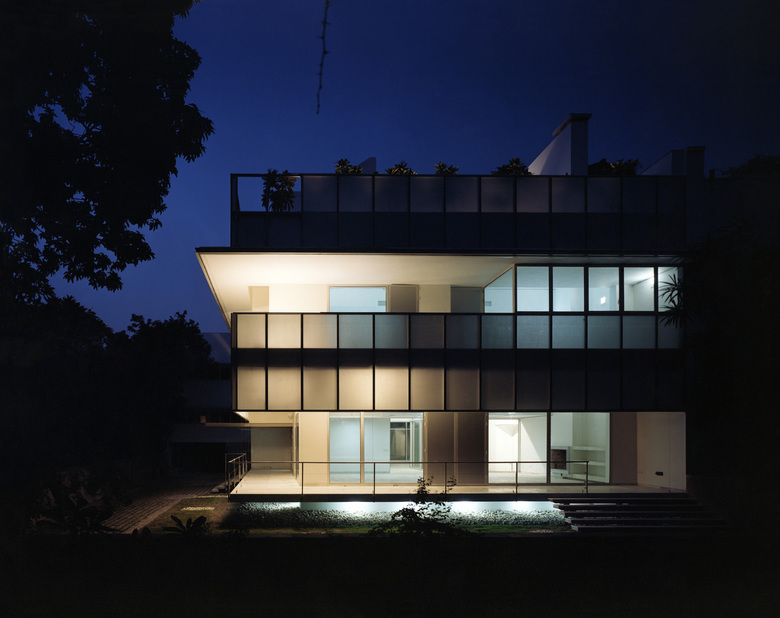 A new type of structural glazing integrating a perforated aluminum sheet was especially developed in order to provide transparency and heat rejection at the same time, keeping the soft light of a traditional jali wall with a low maintenance material, ever changing with the sun course. The house becomes a light box at night when the illumination comes from the inside.
