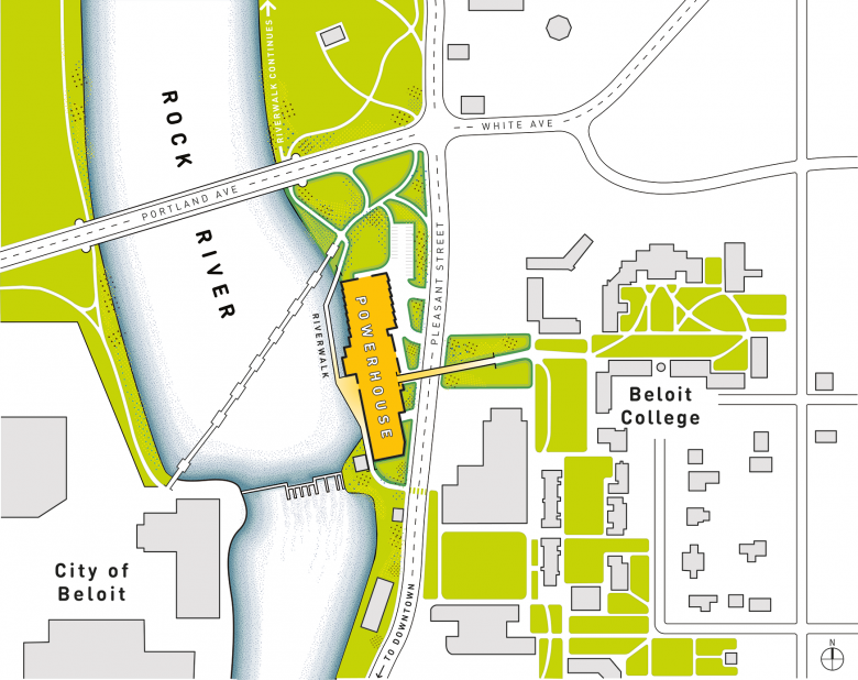 A new pedestrian bridge and publicly-accessible elevator connect the Beloit College campus, which sits on a hill, with the Powerhouse and the adjacent riverside paths and parks at ground level. Forming these new links between town, gown, and river, the former power plant is now generating a more energetic and vibrant community life.