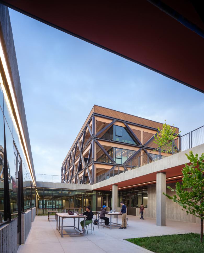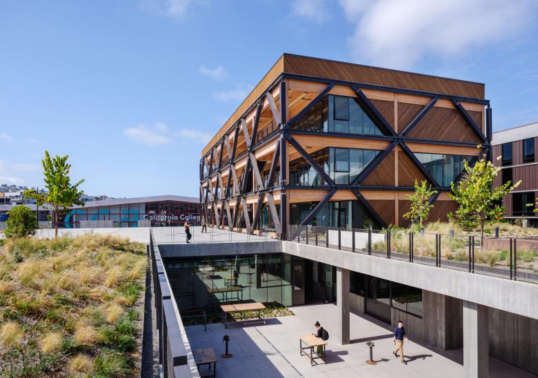 Emerging from the building’s base, two mass timber pavilions house classrooms, art studios, and the new home of the CCA Wattis Institute for Contemporary Arts. Both pavilions lead onto a green terraced landscape that unites the building’s lower and upper levels. Their deep balconies enable exterior circulation as well as informal learning, working, and social spaces where the CCA community can enjoy San Francisco’s mild climate. Their structures, which are among the first exposed mass timber structures in California and include a one-of-a-kind eccentric braced frame system, allow their natural materiality and lateral and gravity loads to be visible.