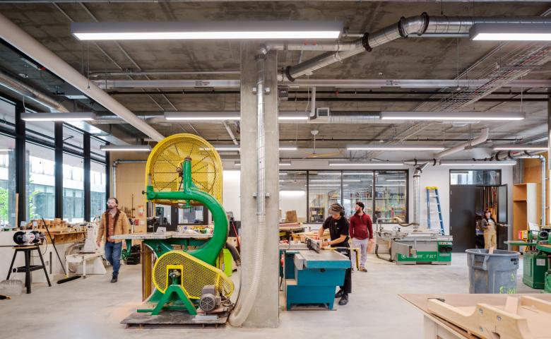 The design also supports CCA’s commitment to sustainability through strategies that serve environmental and experiential purposes. The hybrid mass timber structure and minimal finishes reduce the building’s embodied carbon footprint by almost half that of a typical baseline building. Physically intensive practices with heavy equipment are strategically located to concentrate structural loads and mechanical infrastructure on the ground level as well as provide adaptability as new needs, mediums, and technologies develop. Other passive design strategies, such as self-shading façades and night-flush ventilation, naturally cool the building to reduce the size and energy demand of mechanical systems. The building also has infrastructure in place to enable a closed-loop, net-positive building in the future.